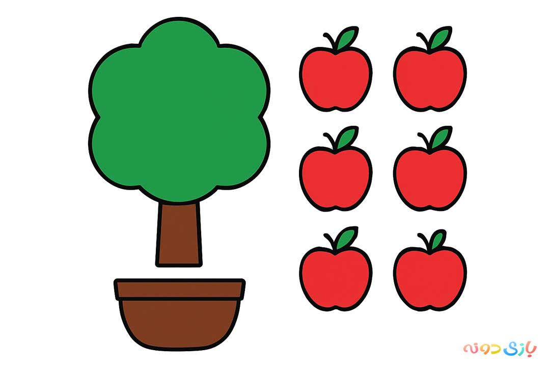 هدف: درختی با سیبهای جدا شونده که کودک بتواند آنها را چیده و در یک سبد قرار دهد.