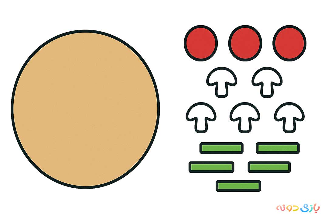 3. پیتزای خلاقیت: یک دایره بزرگ از نمد کرمرنگ به عنوان خمیر پیتزا روی صفحه قرار دهید. سپس انواع مخلفات پیتزا (دایرههای قرمز سوسیس، نوارهای سبز فلفل دلمهای، قارچ و…) را با چسب ولکرو آماده کنید تا کودک بتواند پیتزای مخصوص خودش را بسازد و با آن شمارش را تمرین کند.