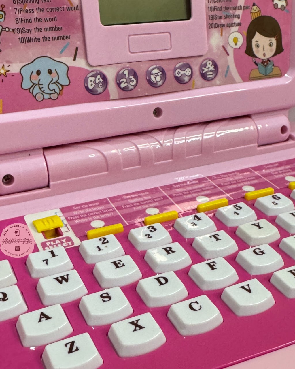 - صفحه نمایش جذاب و نورانی: لپتاپ دارای یک صفحه نمایش کوچک است که با پخش انیمیشنها و تصاویر جذاب، بازیها را برای کودک دیدنیتر میکند. 🖥️