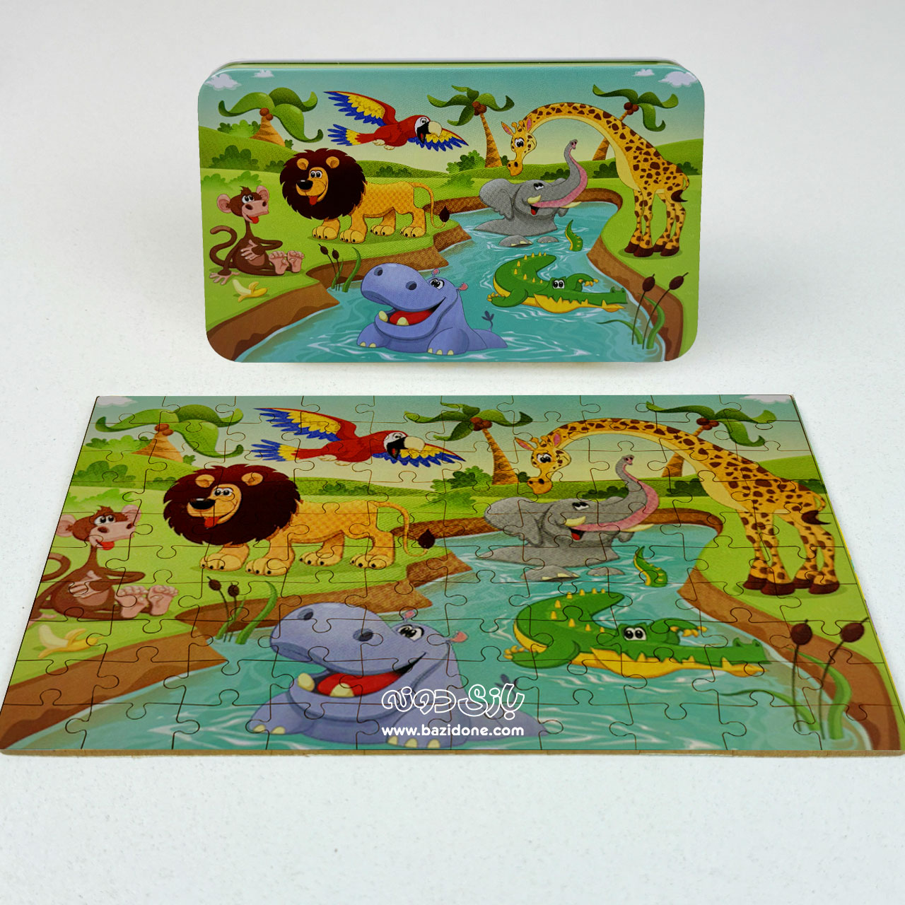 60 قطعه پازل: قطعاتی با برش دقیق و ابعاد مناسب برای دست کودک، که به راحتی در یکدیگر چفت میشوند. (جنس قطعات در اغلب مدلها چوبی یا مقوای فشرده و مرغوب است که دوام بالایی دارند.)