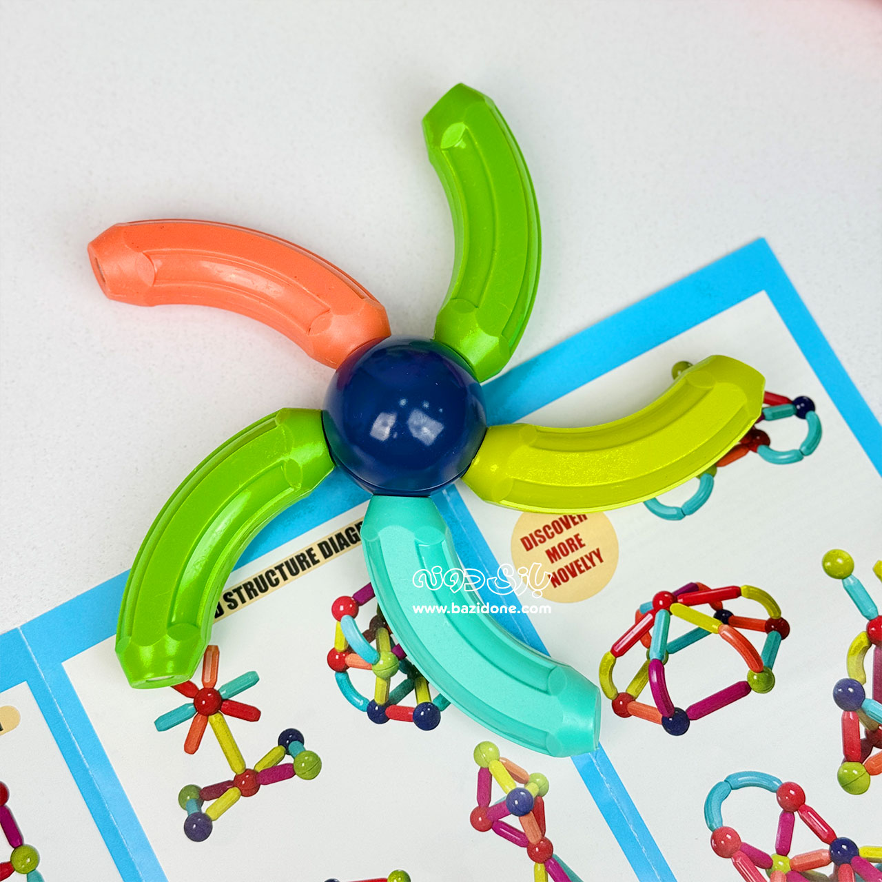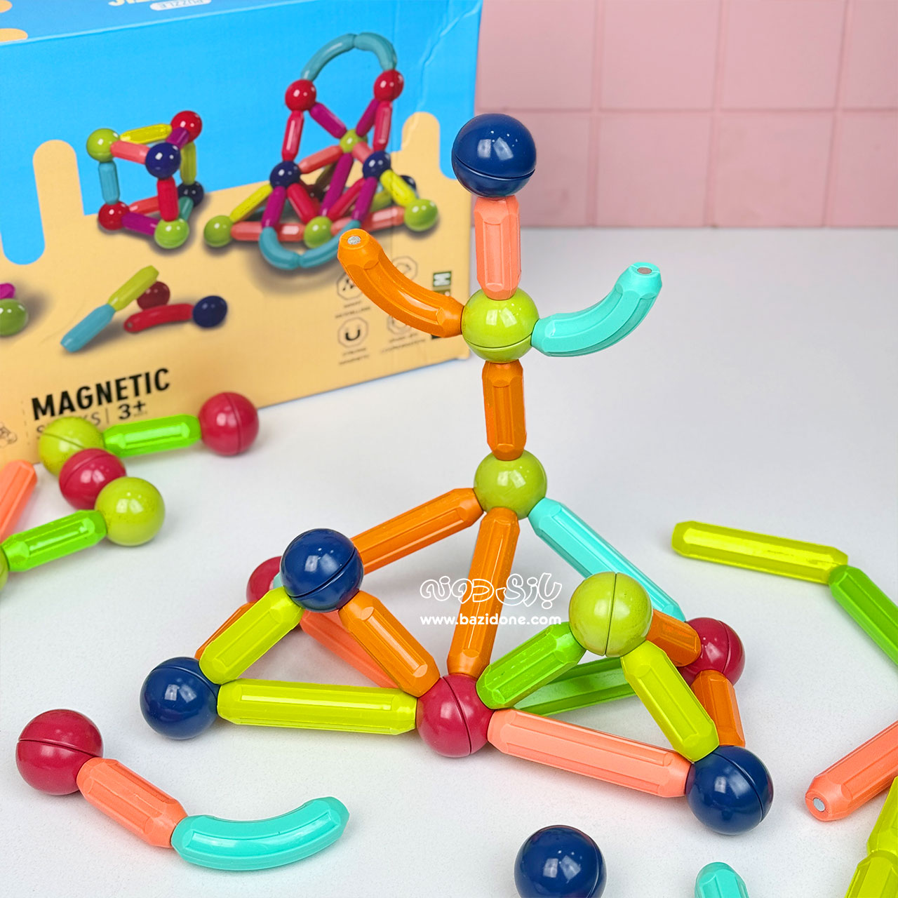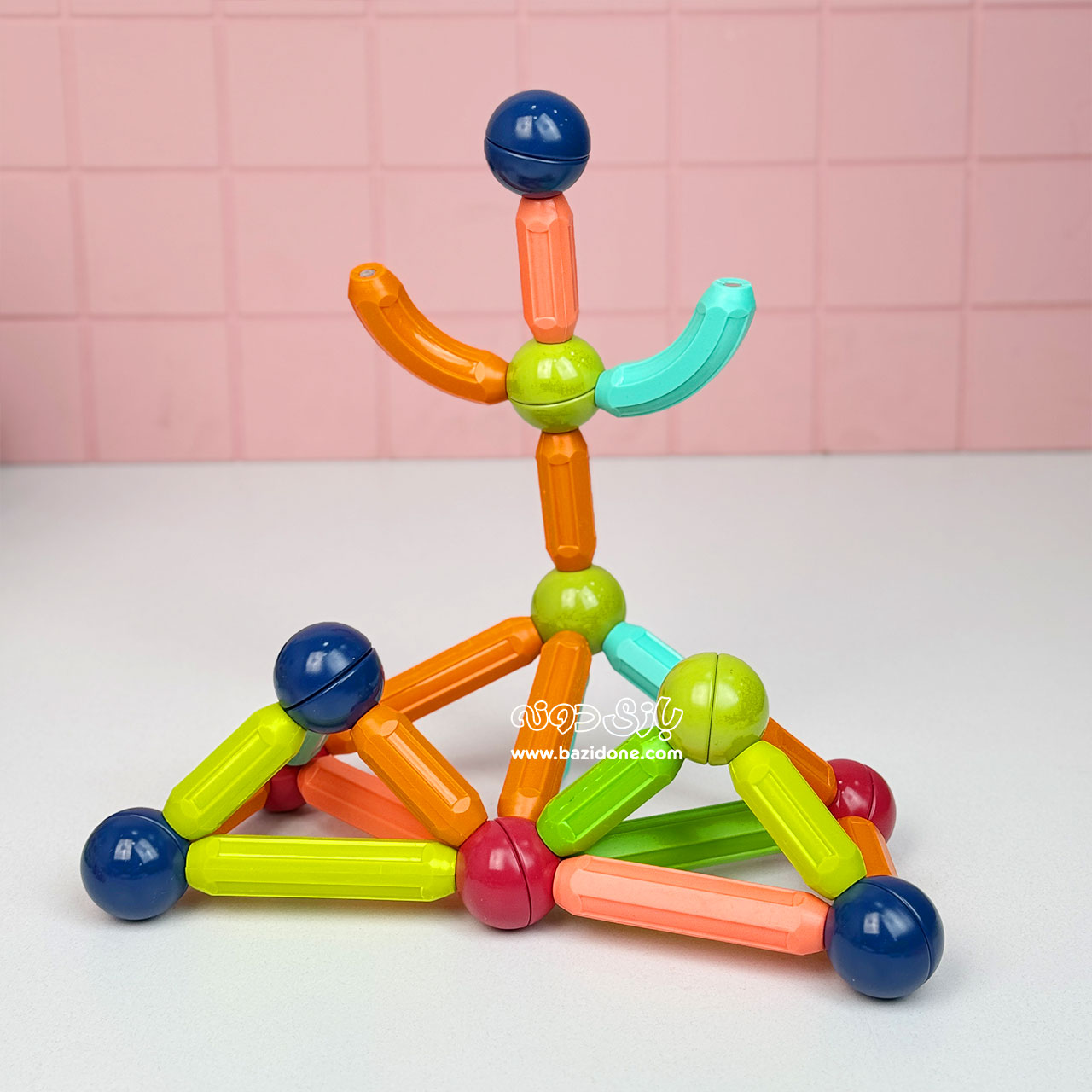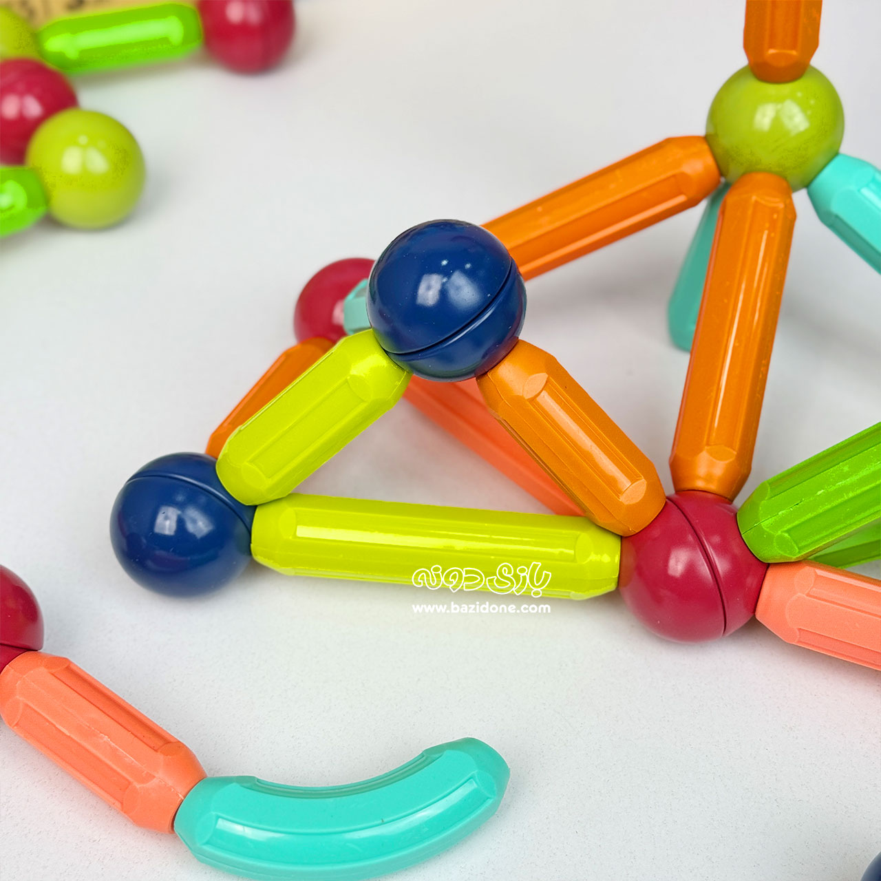 - قطعات مغناطیسی: میلهها و توپها به راحتی و با نیروی مغناطیسی به هم متصل میشوند و کودکان به آسانی میتوانند با آنها کار کنند. این ویژگی باعث میشود بازی با آنها برای کودکان بسیار جذاب باشد. ✨