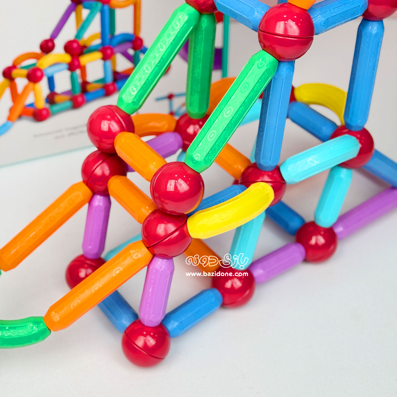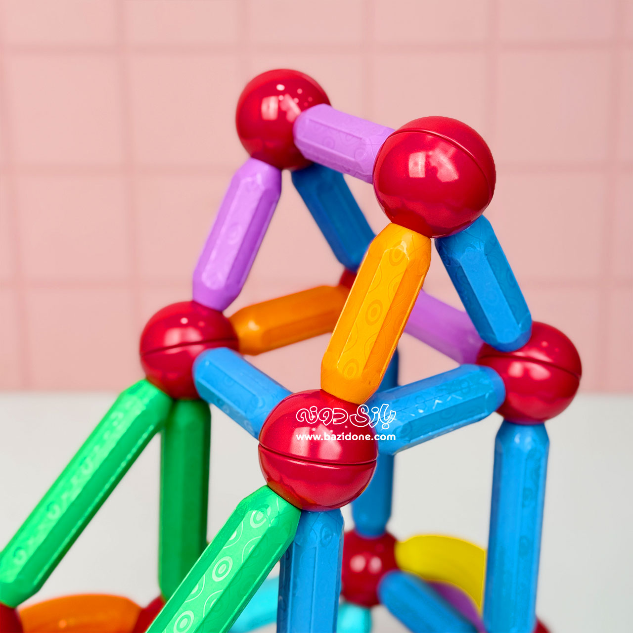 - قطعات مغناطیسی: میلهها و توپها به راحتی و با نیروی مغناطیسی به هم متصل میشوند و کودکان به آسانی میتوانند با آنها کار کنند. این ویژگی باعث میشود بازی با آنها برای کودکان بسیار جذاب باشد. ✨