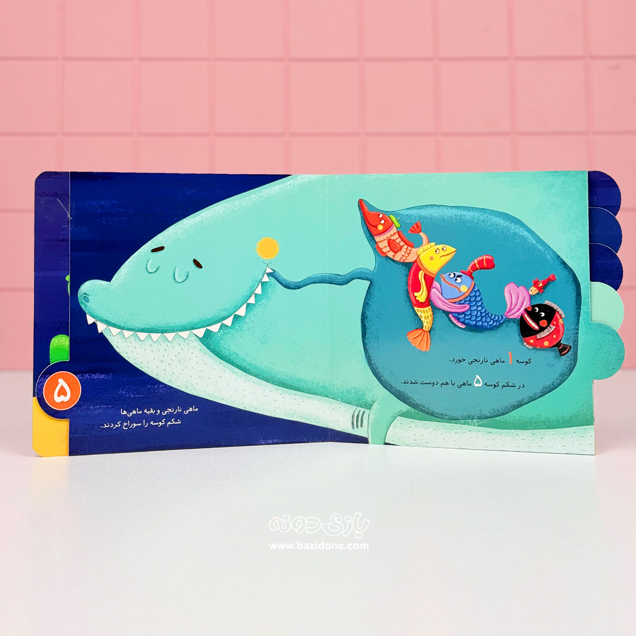 کتاب یک کوسه و پنج ماهی یه کتاب جلد سخت از مجموعه نی نی آموزه که به کودکان خردسال شما شمارش اعداد رو با داستان آموزش میده.