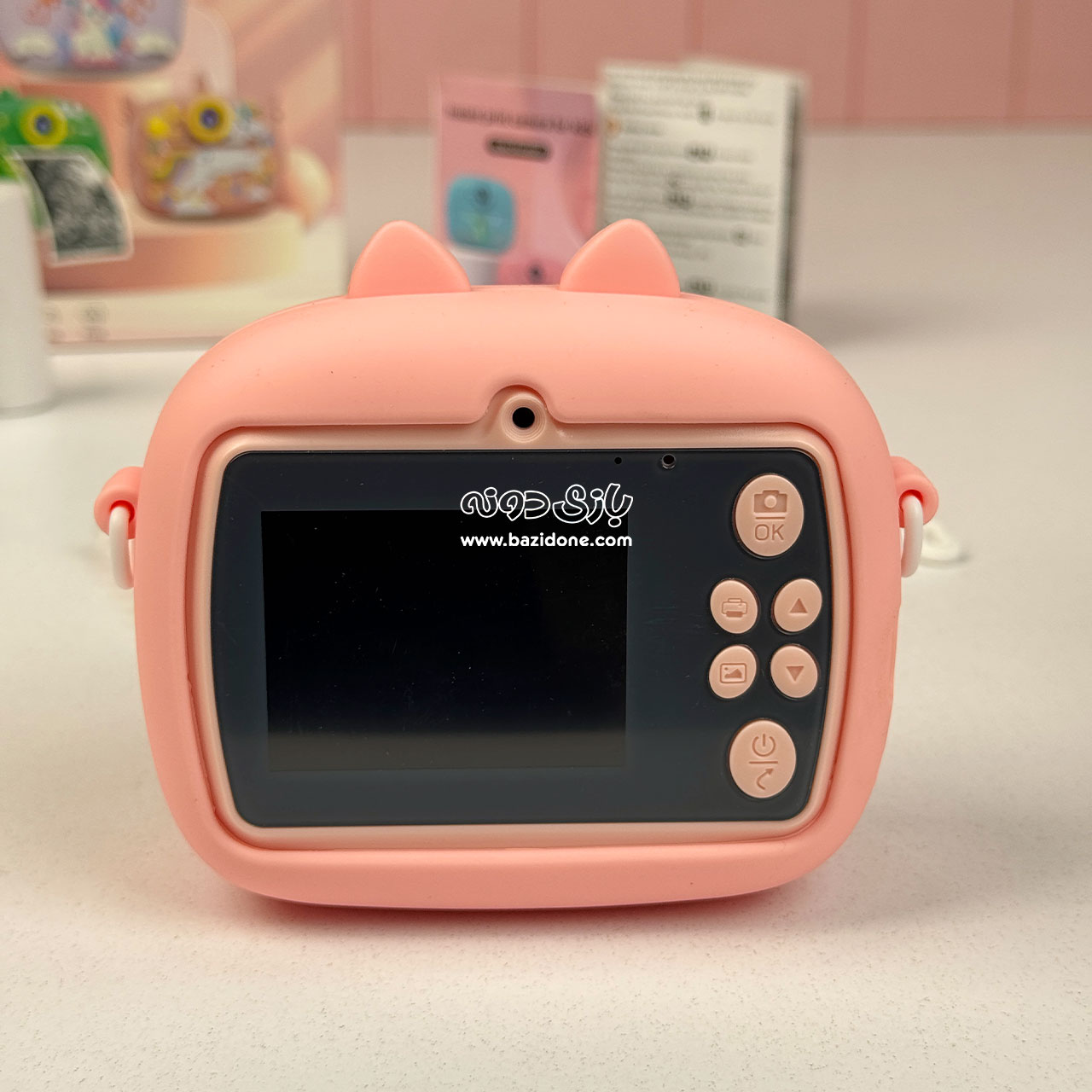 - طراحی کودکانه و ایمن: دوربین در یک قاب محافظ نرم و سیلیکونی با طرح حیوانات بامزه قرار دارد که از آن در برابر ضربه و زمین خوردن محافظت میکند. طراحی ارگونومیک آن نیز برای دستهای کوچک کودکان مناسب است. 🦁🐱