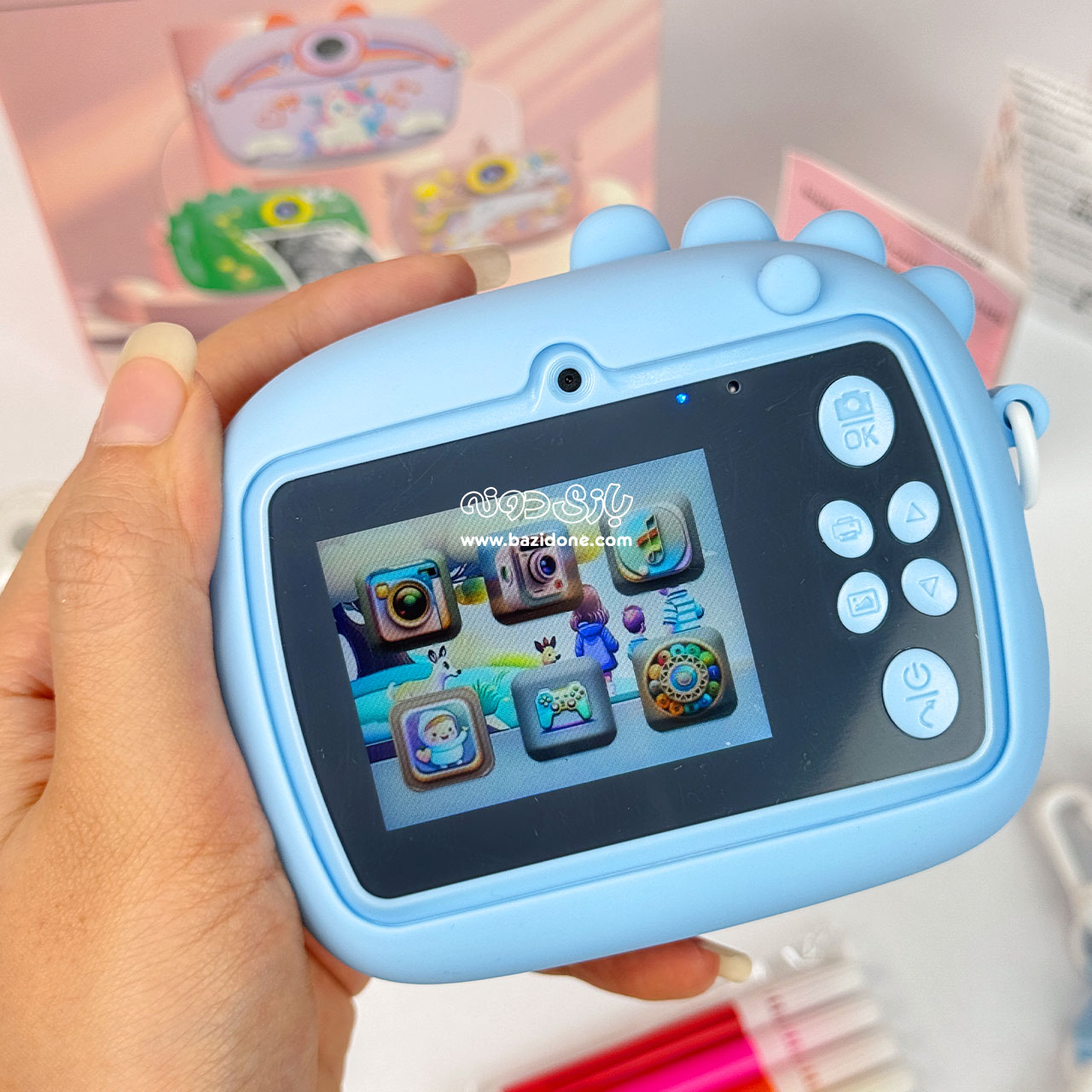 - قابلیتهای خلاقانه: این دوربین دارای چندین فیلتر، فریم و استیکر فانتزی است که کودک میتواند از آنها برای تزئین عکسهای خود استفاده کند. این ویژگی خلاقیت و حس هنری کودک را تقویت میکند. 🎨✨