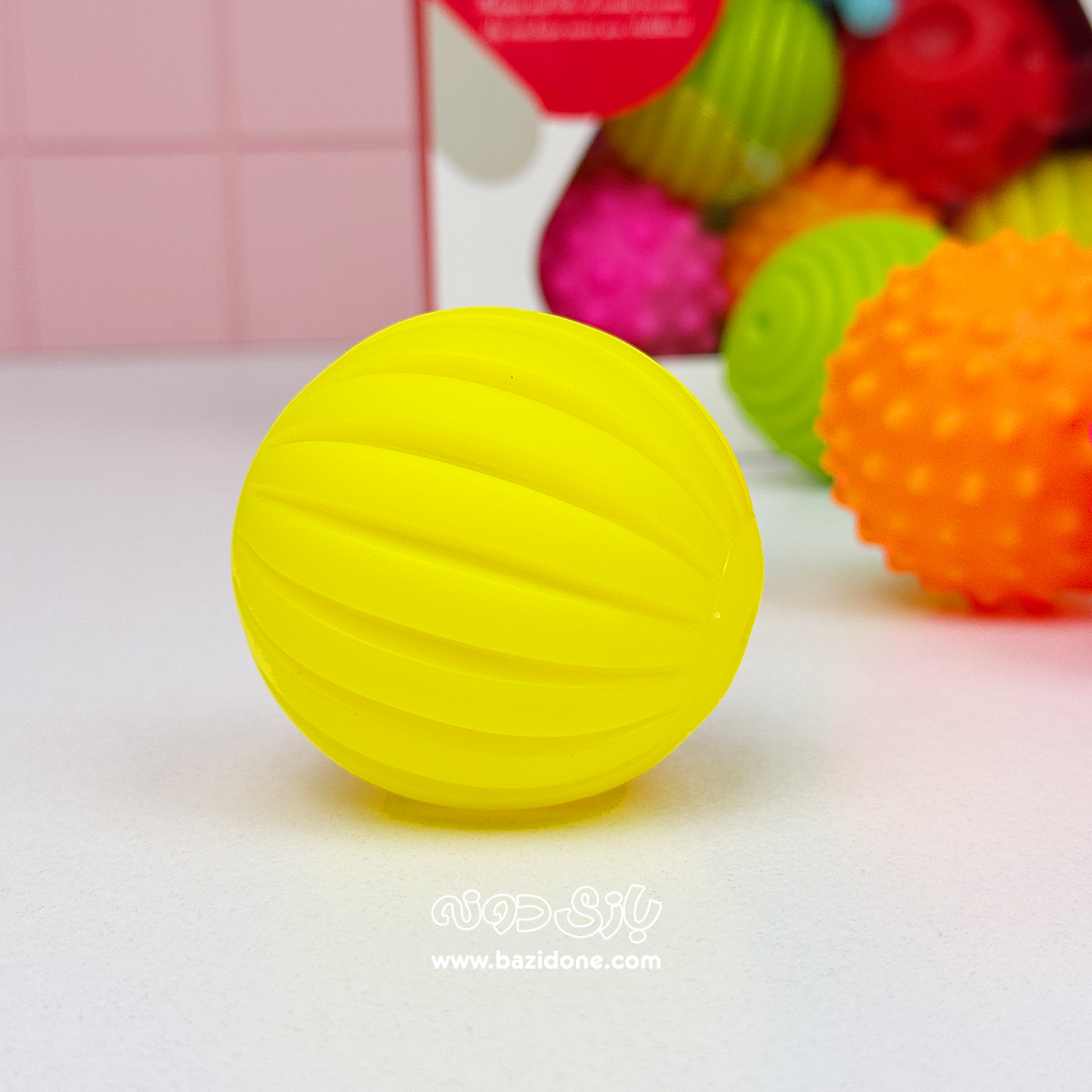 - تحریک جامع حس لامسه و بینایی: هر توپ دارای یک بافت برجسته و منحصر به فرد است. این مجموعه شامل توپهایی با طرحهای مختلف مانند خالهای درشت و ریز، خطوط عمودی و افقی، و طرحهای ستارهای و حفرهدار است. لمس این بافتهای متفاوت، حس لامسه کودک را به خوبی تحریک میکند و به او کمک میکند تا تفاوتهای حسی را از طریق لمس درک کند. رنگهای زنده و شاد توپها نیز، توجه دیداری کودک را جلب کرده و توانایی او را در تشخیص و تمایز رنگها تقویت مینماید. 🎨