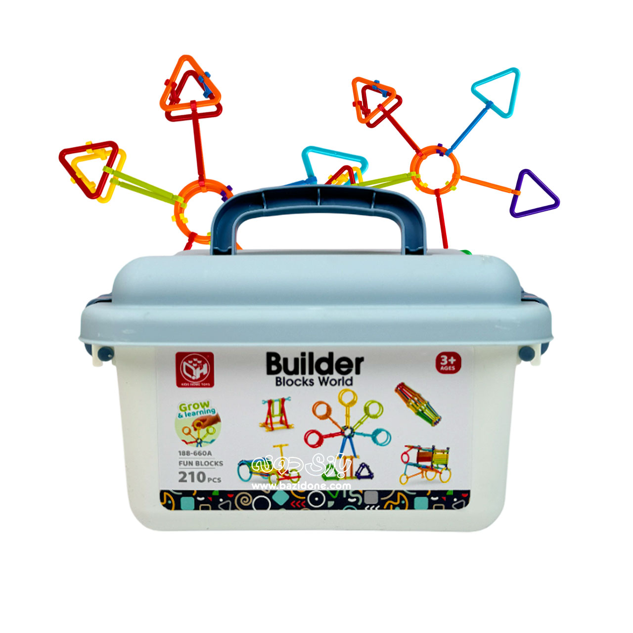 طراحی باکس میلههای هزار کاره 210 قطعهای بر اساس ایمنی، دوام و تشویق به بازی تعاملی بنا شده است. قطعات درشت و خوشدست هستند و به آسانی توسط دستهای کوچک کودکان قابل اتصال و جداسازیاند.