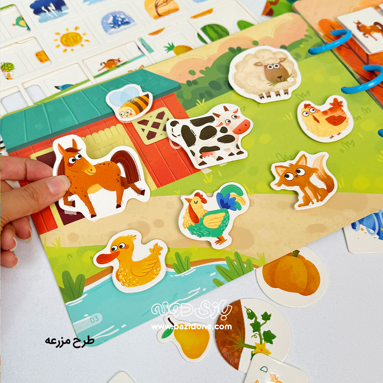 در هر صفحه از این کتاب، آموزشهایی مثل تشخیص حیوانات، حروف الفبا، پازل، جا گذاری اشکال، یافتن خانه ای برای سبزیجات و میوه ها، آب و هوا، اعداد، رنگ و … به کودک داده میشود که برای کودکان پیش دبستانی بسیار ایده آل است. با کمک این کتاب مونته سوری کودکان با رنگ ها، تعداد، اشکال و دسته بندی، طبقه بندی و الگو خوانی آشنا می شوند.