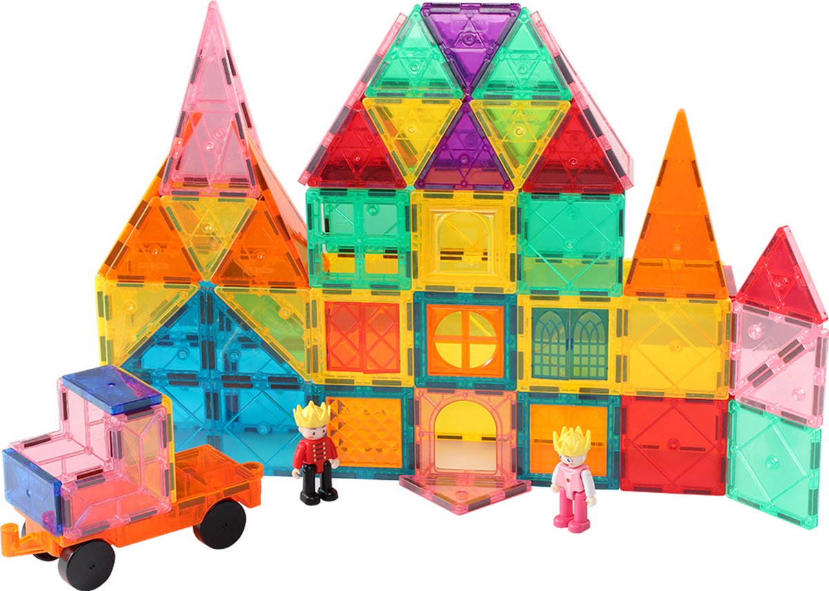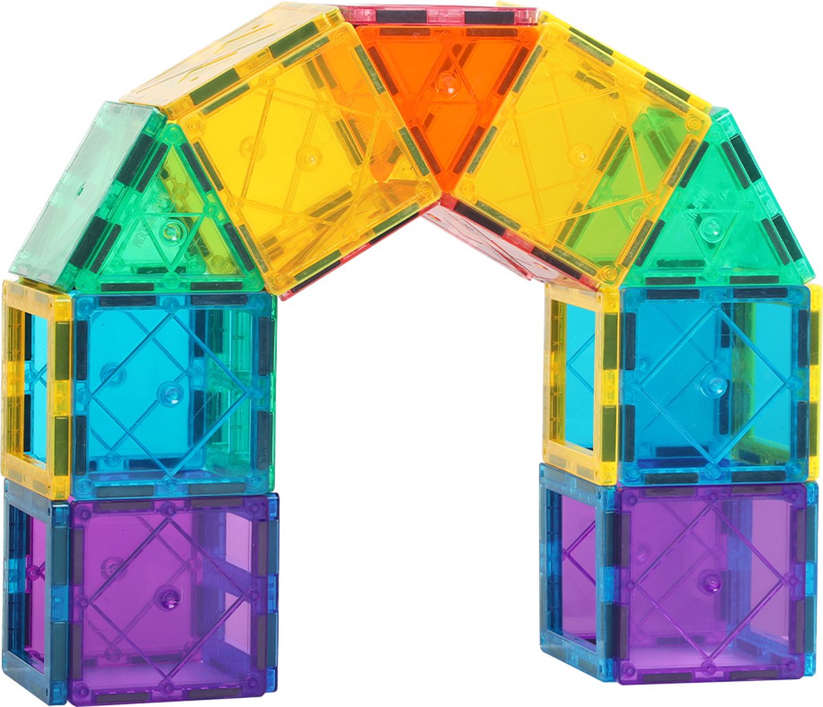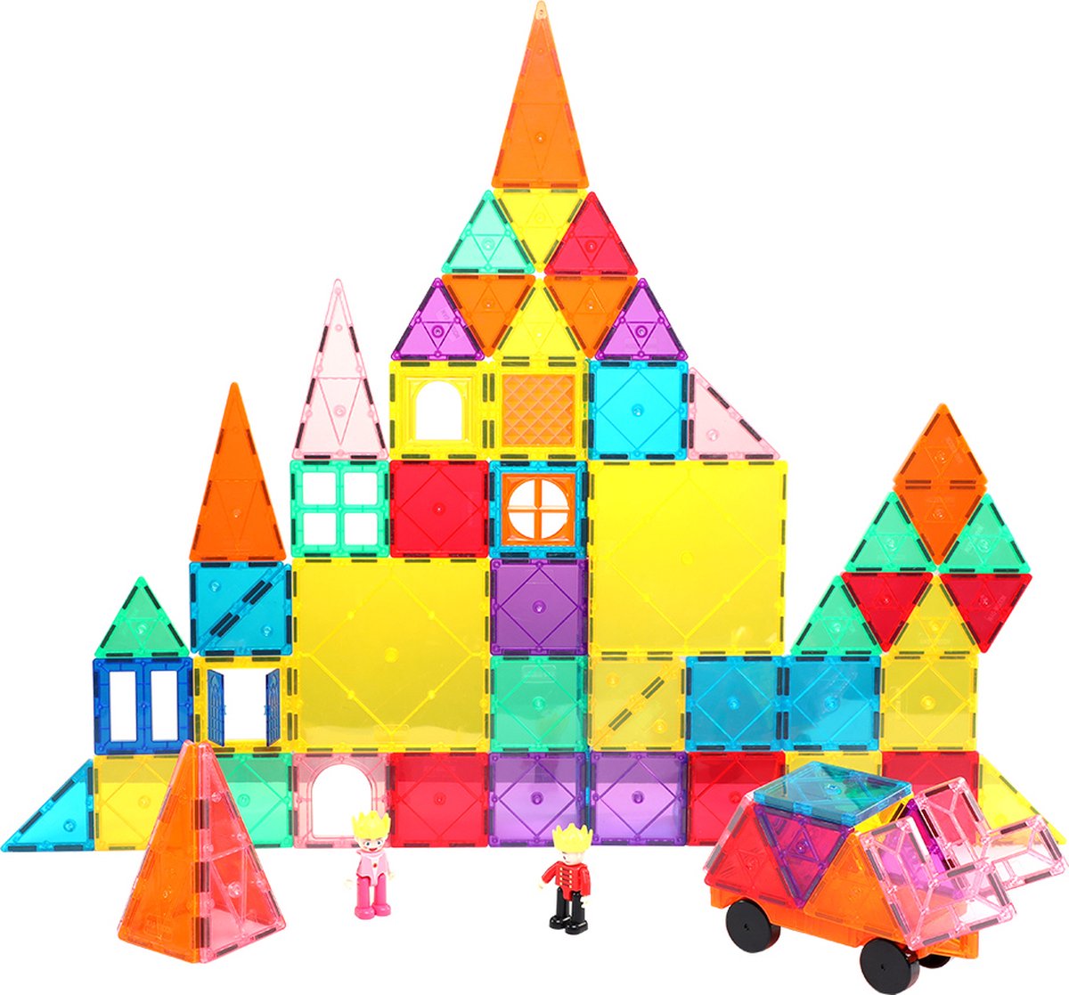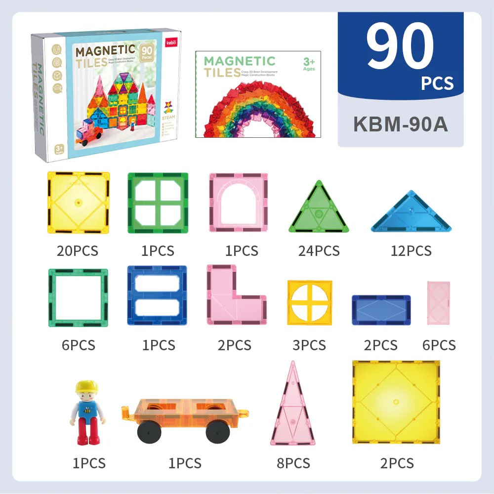 - تایلهای مغناطیسی: 90 قطعه تایل در شکلها و اندازههای مختلف (مربع، مثلث، لوزی، پنجضلعی و…) که برای ساختن سازههای متنوع مناسب هستند. این تایلها با لبههای صاف و صیقلی، برای دستهای کوچک کودکان کاملاً ایمن هستند.