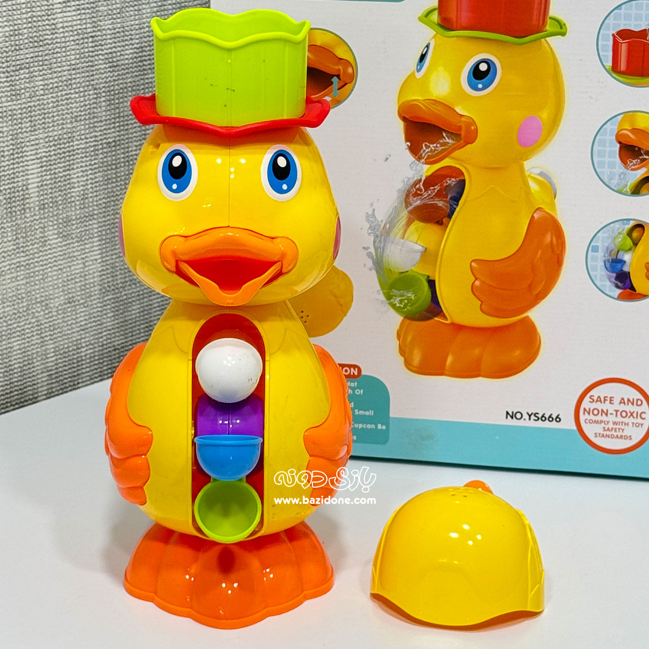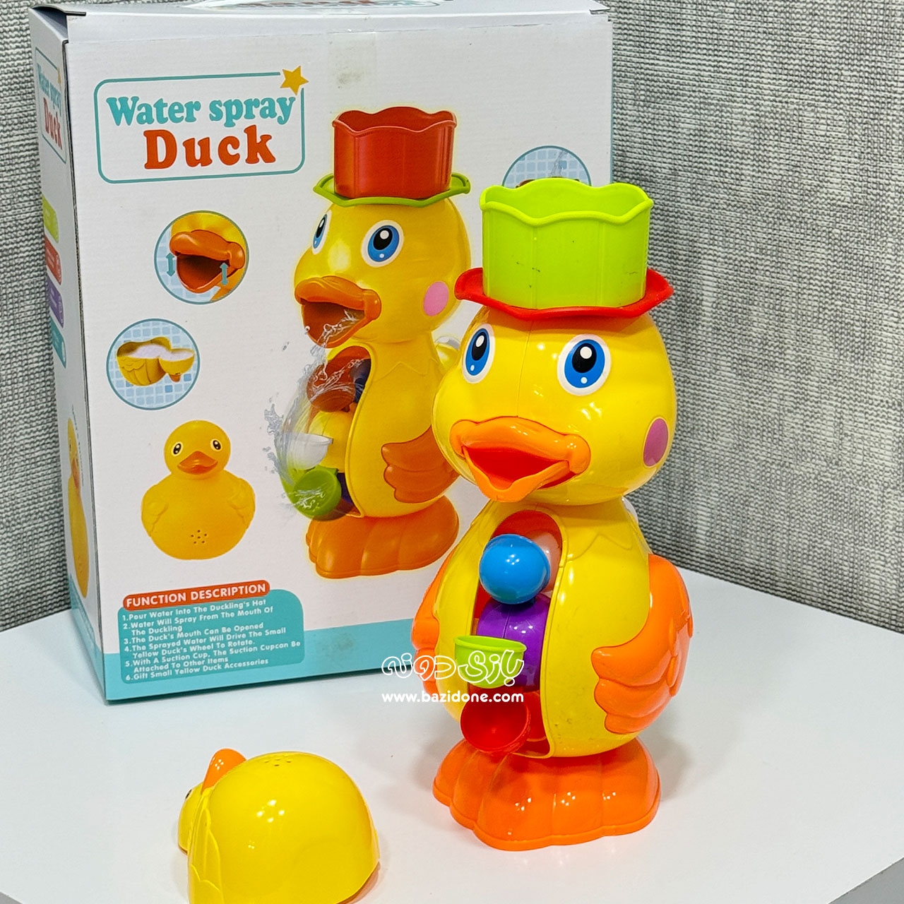 خیلی سادهست! کافیه یه لیوان آب 💧 رو روی سر جوجه اردک بریزید. آب از دهن اردک کوچولو بیرون میاد و همزمان فرفره روی شکمش هم میچرخه! 🌀 اینطوری کوچولوتون ساعتها سرگرم میشه و دیگه از حمام رفتن بدش نمیاد.
