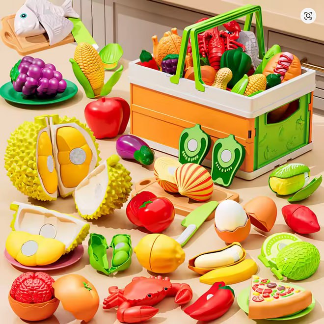این سبد تاشو کلی ویژگیهای خوب و هیجانانگیز داره! ✨ از همه مهمتر، از جنس پلاستیک محکم و ایمن ساخته شده و هیچ تیغه تیز و خطرناکی نداره. 🧸 سبد این مجموعه به راحتی باز میشه و به یه تخته برش برای میوهها تبدیل میشه. میوهها هم با چسبهای مخصوص به هم وصل شدن که باعث میشه کودک به راحتی اونها رو با چاقوی پلاستیکی ببره و دوباره به هم وصل کنه. 🔪 این بازی برای تقویت خلاقیت و قدرت تخیل کودک هم خیلی مفیده، چون میتونه با میوهها کلی داستان آشپزی بامزه بسازه.