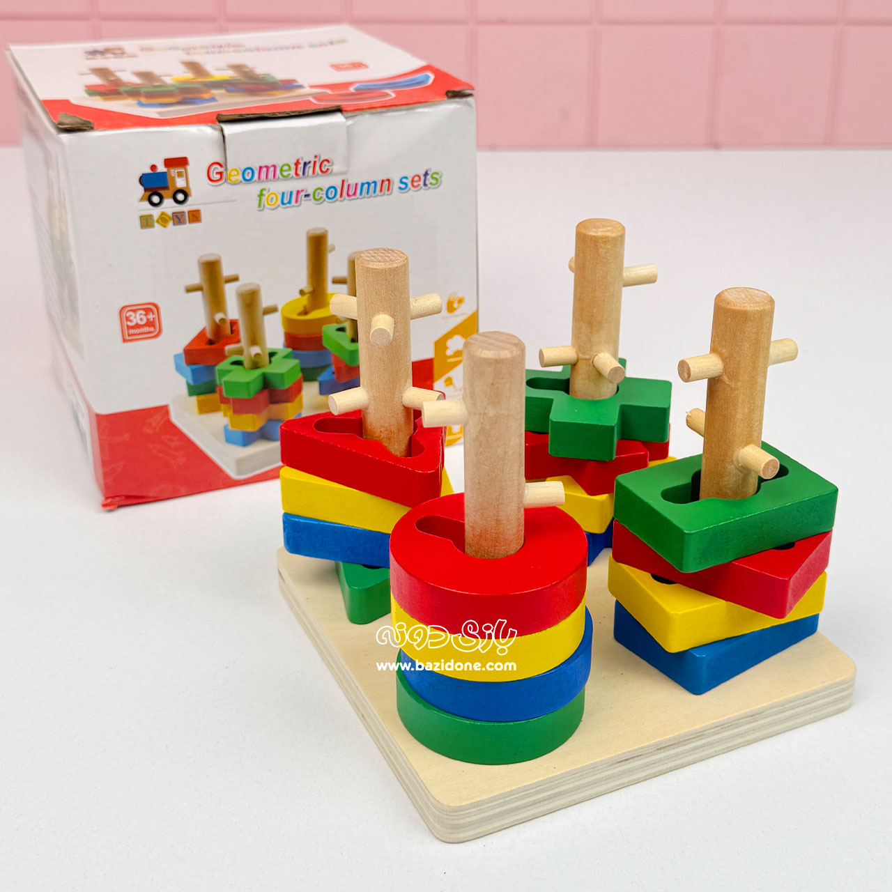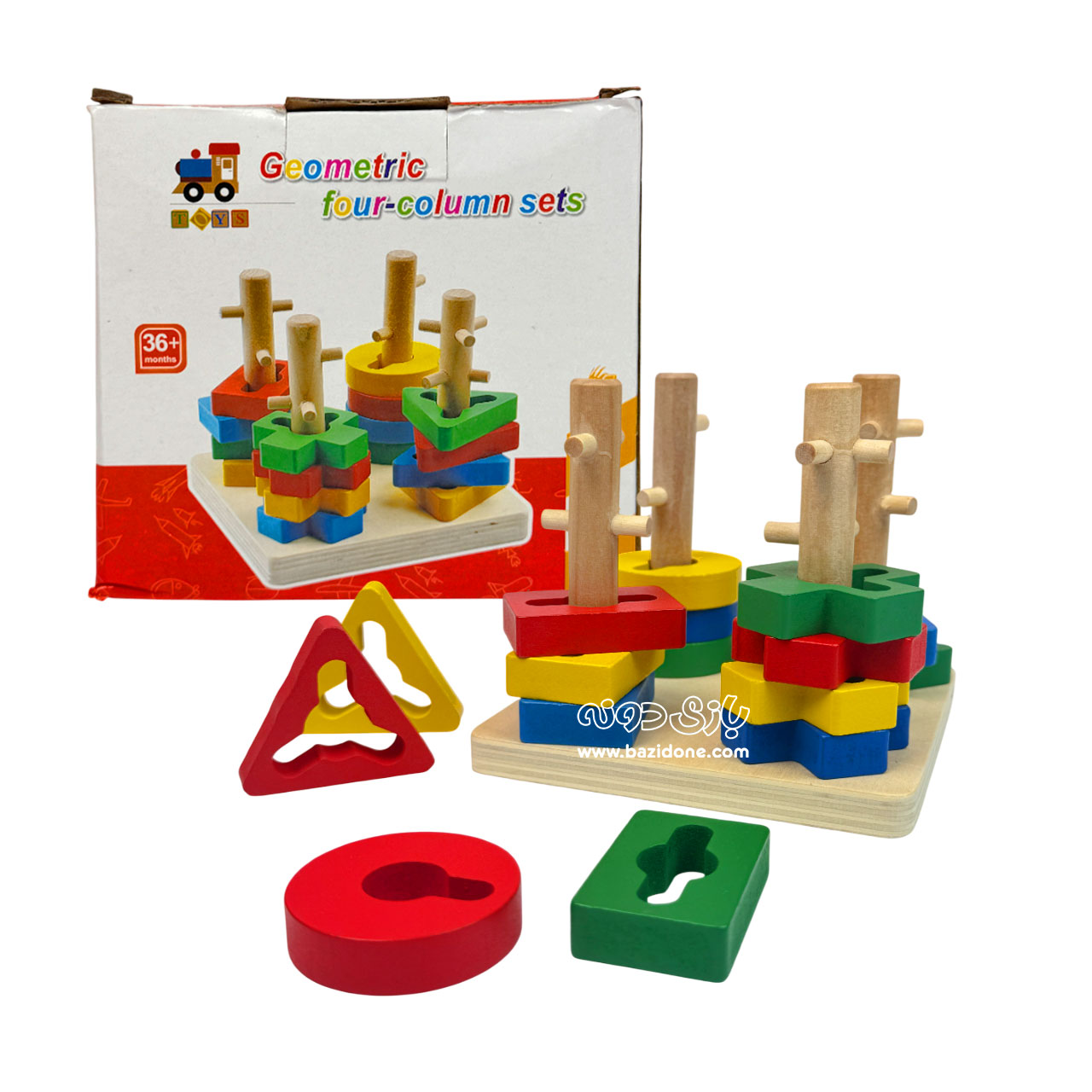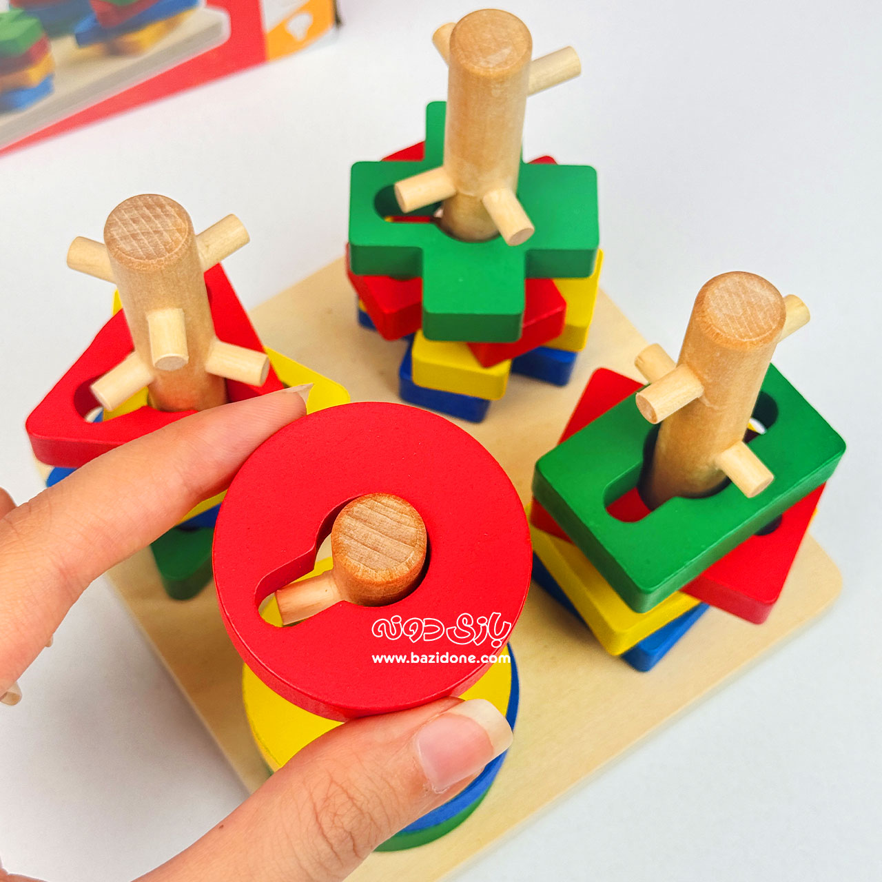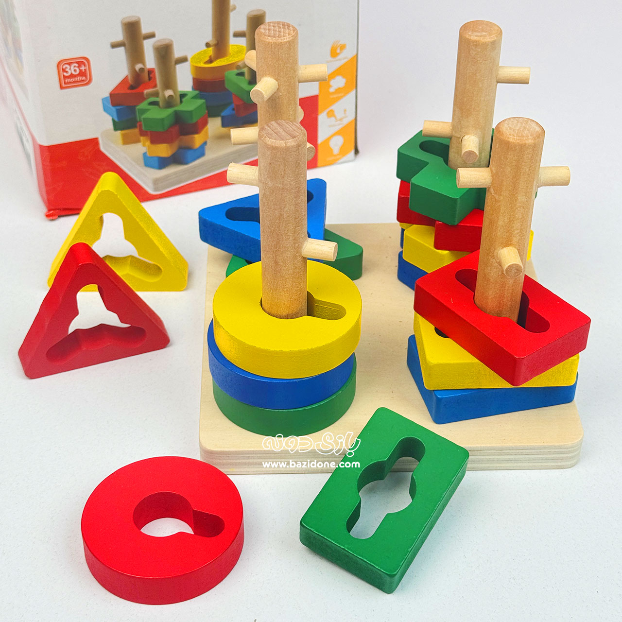 - مجموعه اشکال هندسی چوبی رنگی: شامل انواع اشکال هندسی مختلف برای جایگذاری در ستونهای مربوطه (مانند دایره، مربع، مثلث و شکلهای صلیبی).
