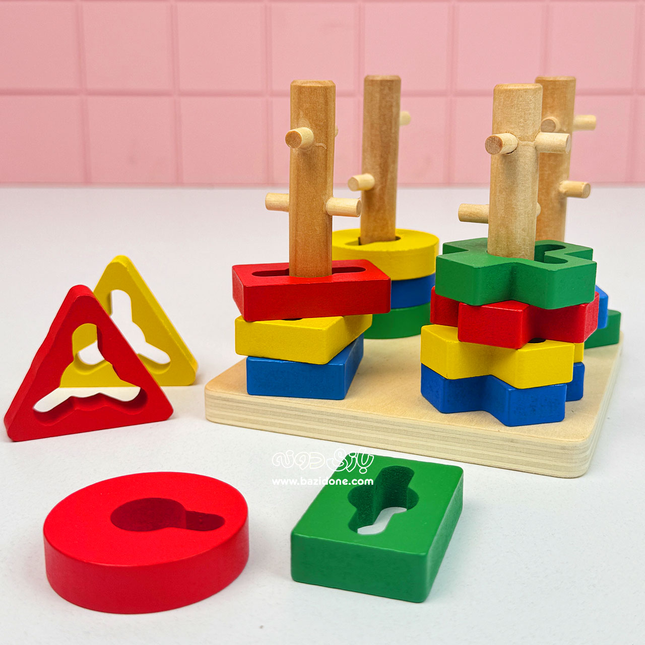 - تقویت مهارتهای ظریف دست و انگشتان: برداشتن، چرخاندن و جایگذاری دقیق اشکال در ستونها، به تقویت انگشتان دست و مهارتهای ظریف دست کودک کمک میکند که برای نوشتن و کارهای روزمره ضروری است.