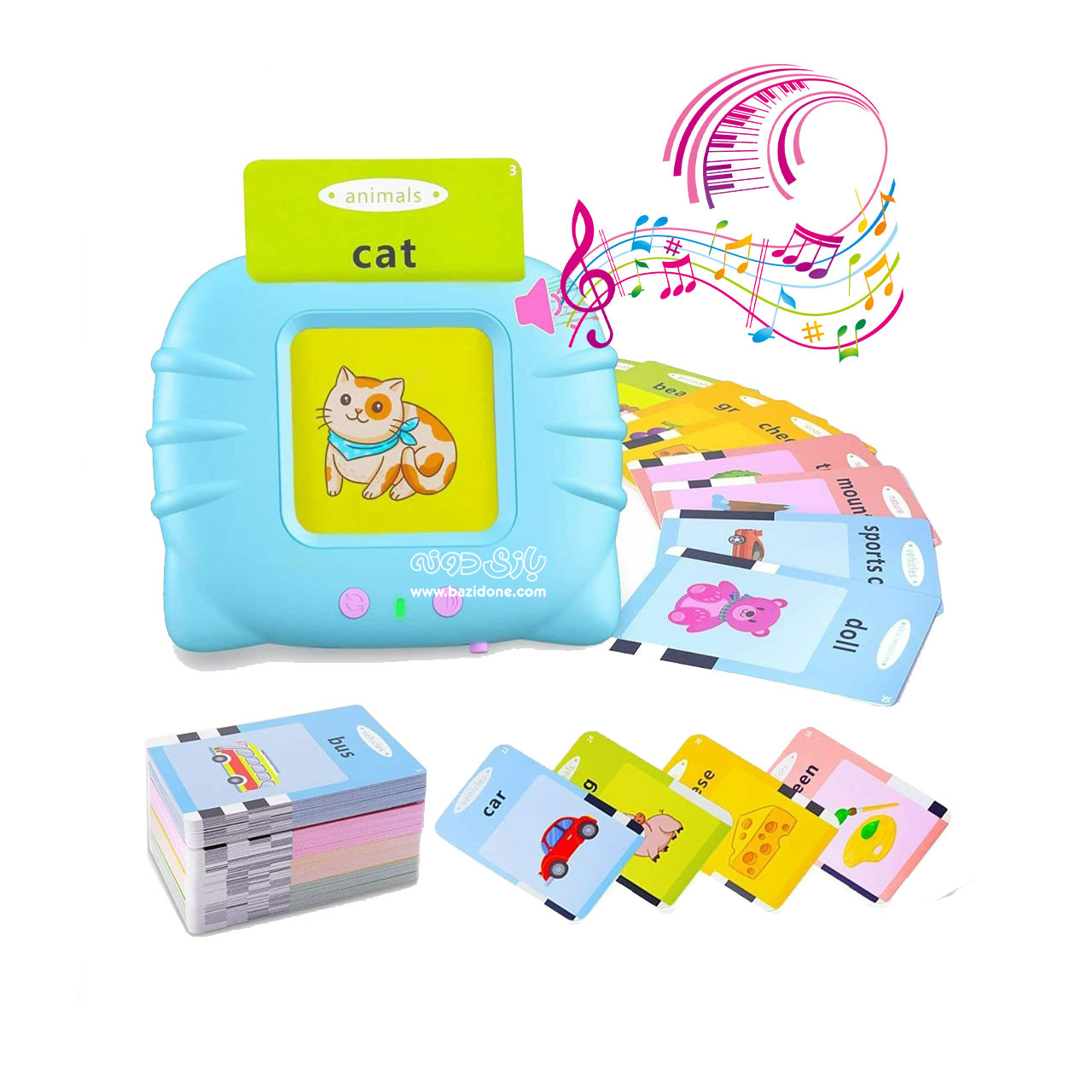 - تقویت حافظه و دایره لغات: این دستگاه با 112 فلش کارت دو رو در عناوین مختلف (از جمله حیوانات، میوهها، غذاها و وسایل نقلیه)، یک دایره لغات گسترده را در اختیار کودک قرار میدهد و با تکرار مداوم، به تقویت حافظه او کمک میکند. 🧠