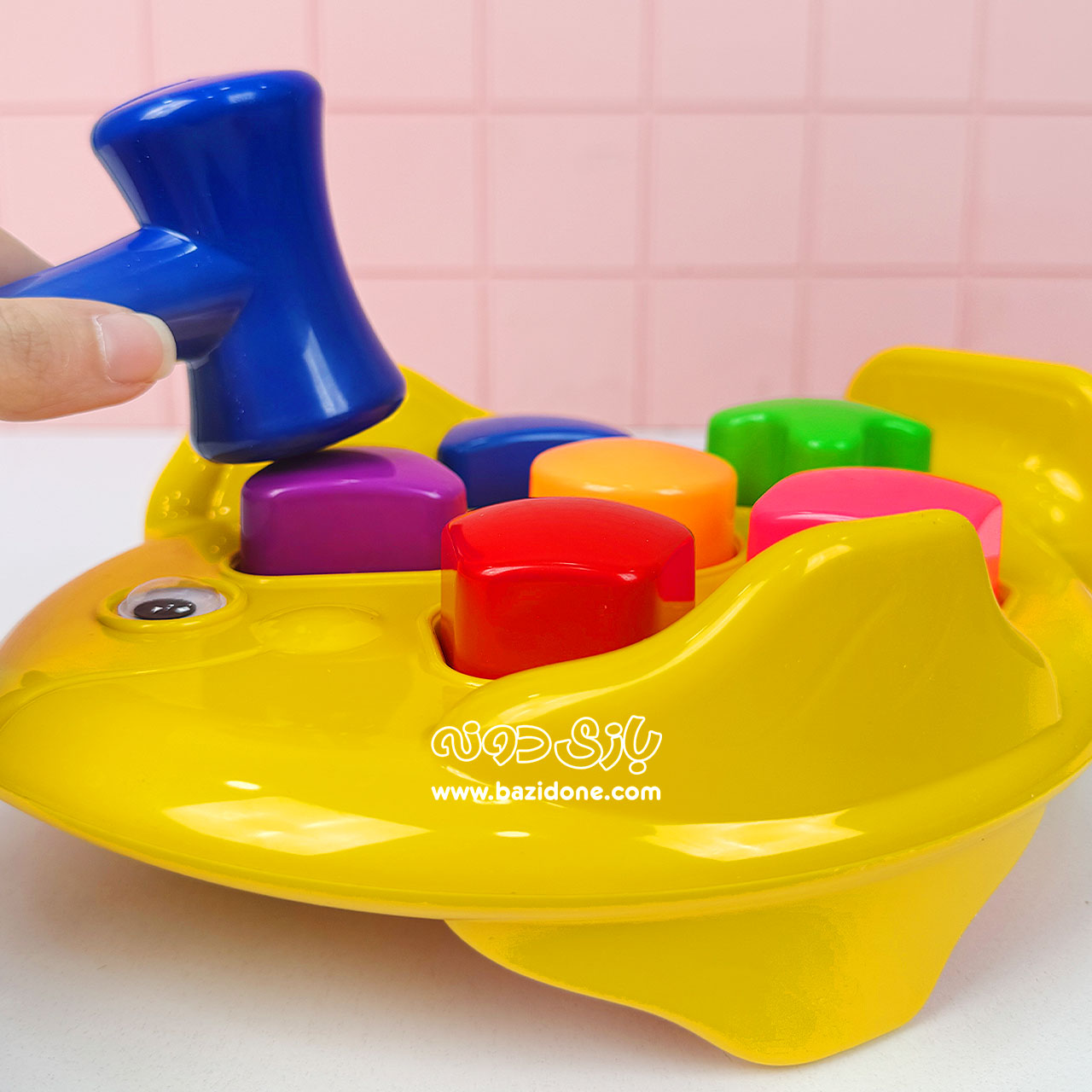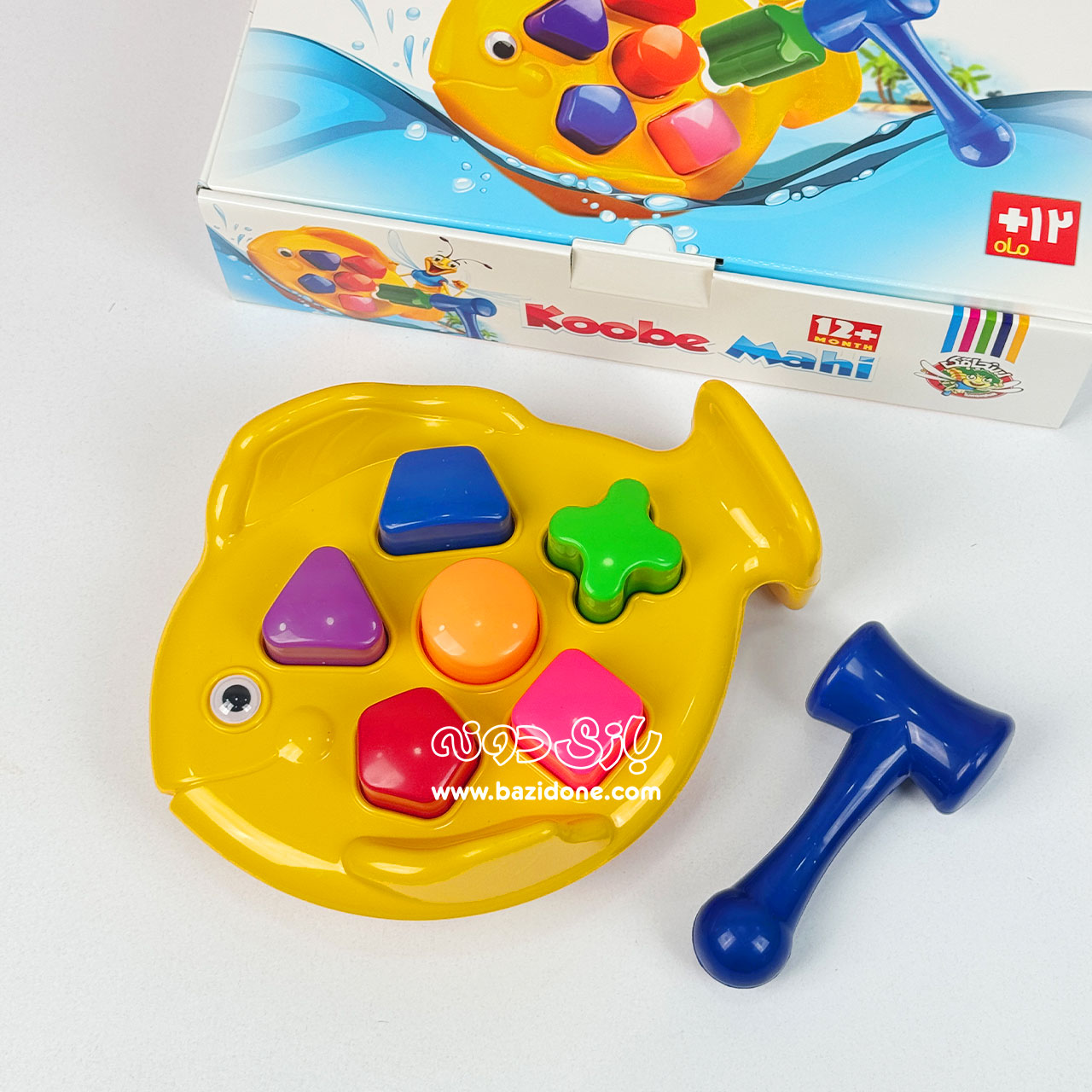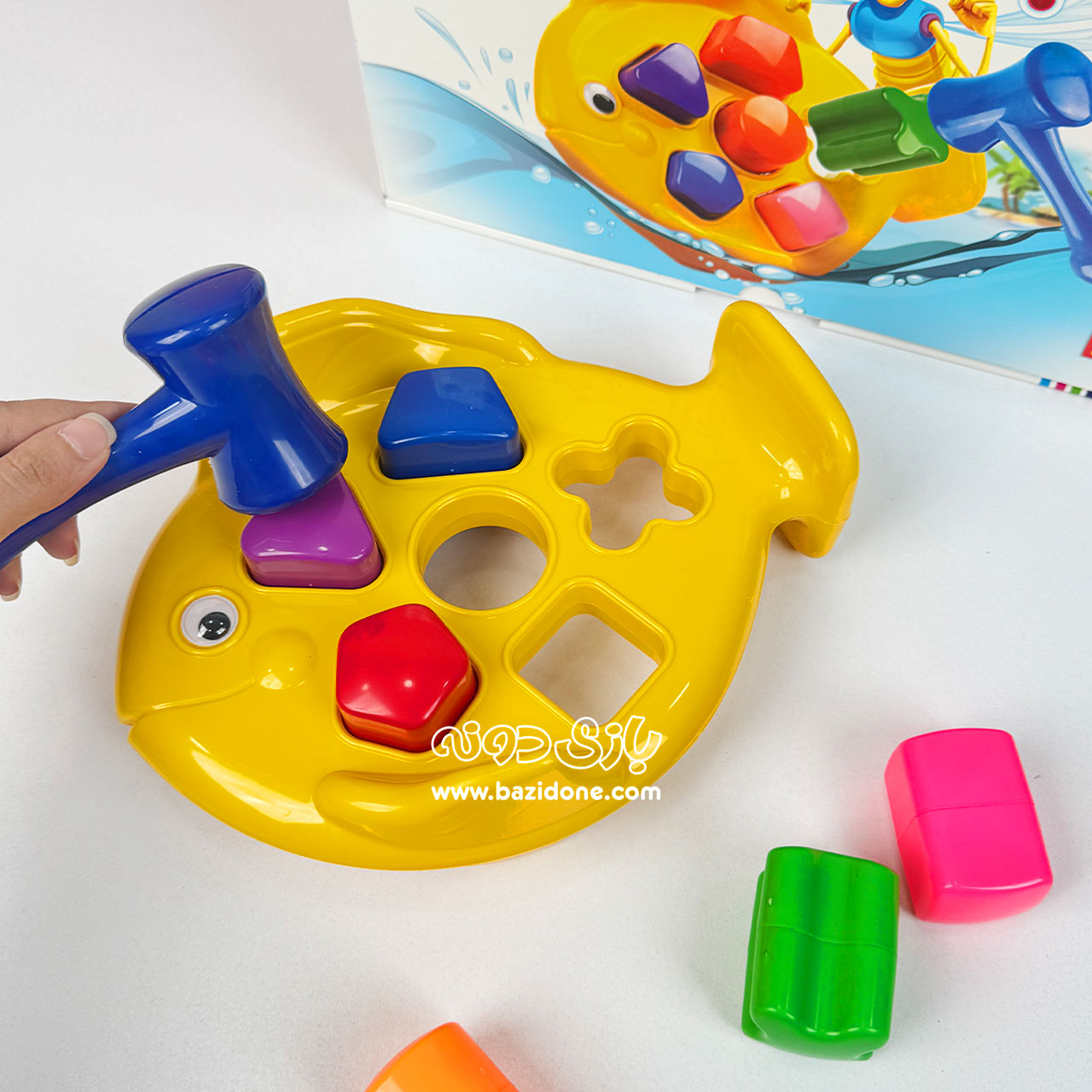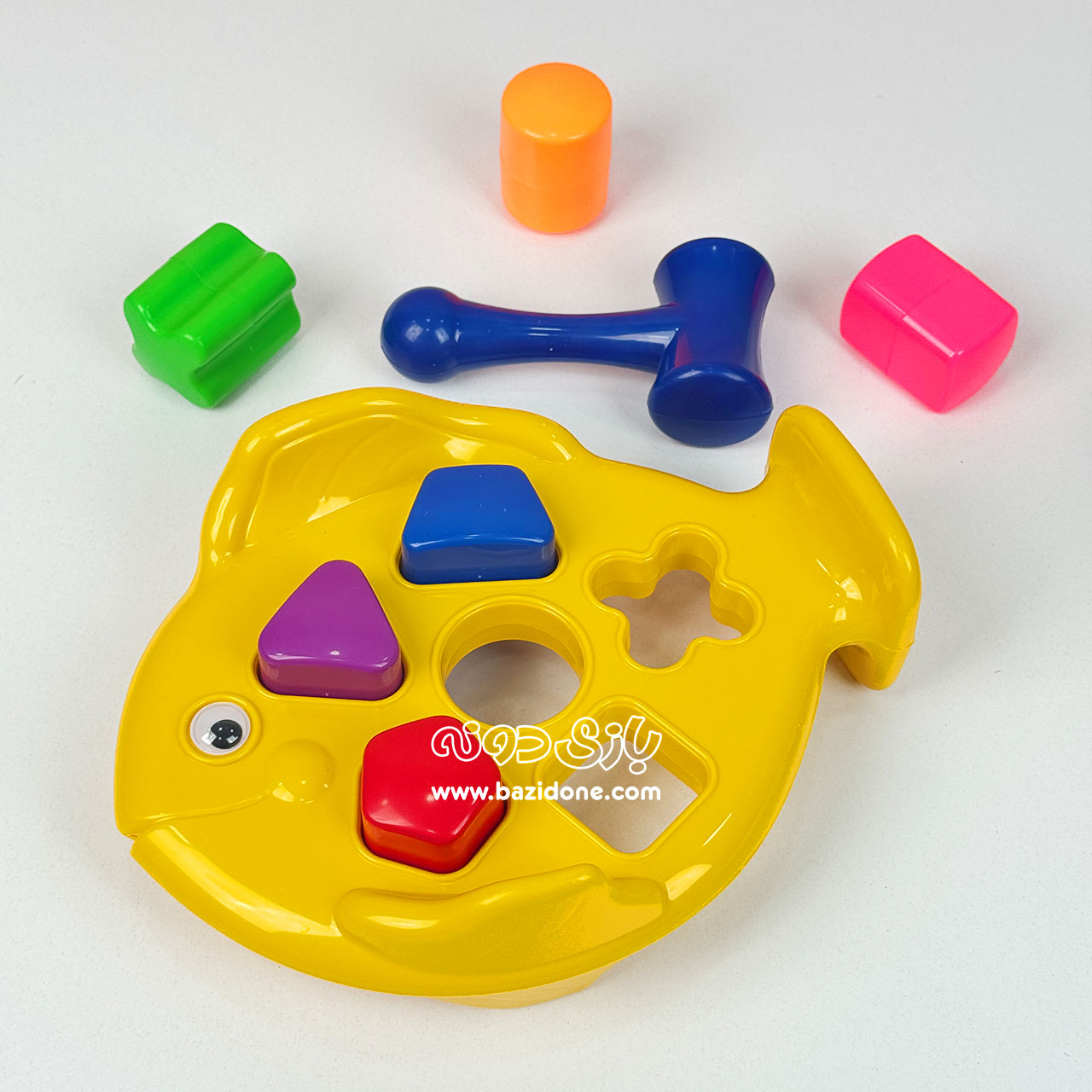 این اسباب بازی به شکل یک ماهی طراحی شده و دارای تعدادی اشکال هندسی به همراه چکش است
