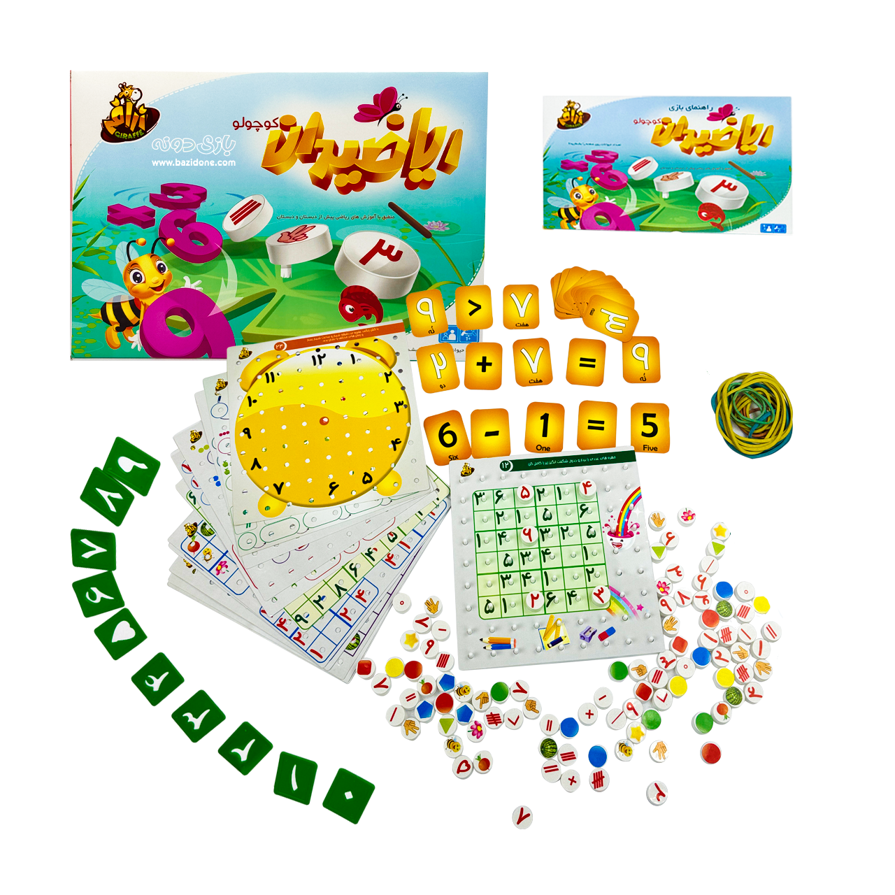 اسباب بازی آموزشی ریاضیدان کوچولو شامل یک صفحه ثابت، ۲۴ عدد کارت آموزشی، ۲۰ عدد کش رنگی، کارت اعداد، شابلون اعداد و مهره های آموزشی می باشد