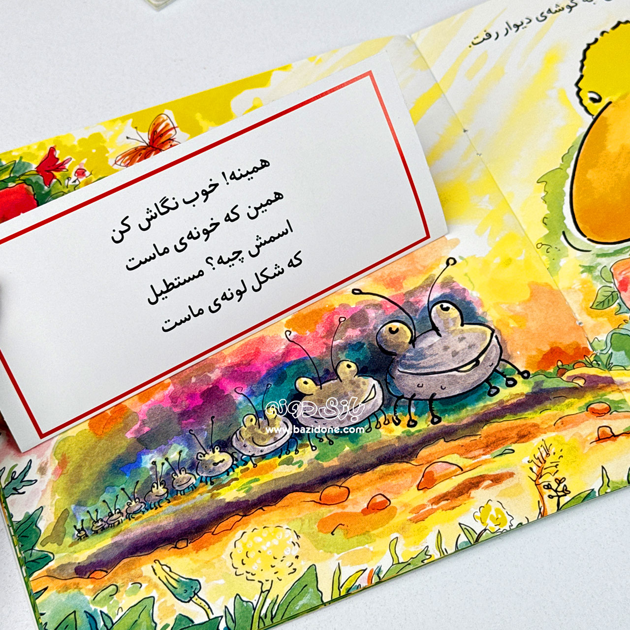کتاب با یک برش و برگهای کوچک روی بخشهایی از داستان را پوشانده است. بنابراین کودک با استفاده از ترفند پیدا و پنهان با شخصیتهایی که به داستان اضافه میشوند، آشنا میشود.