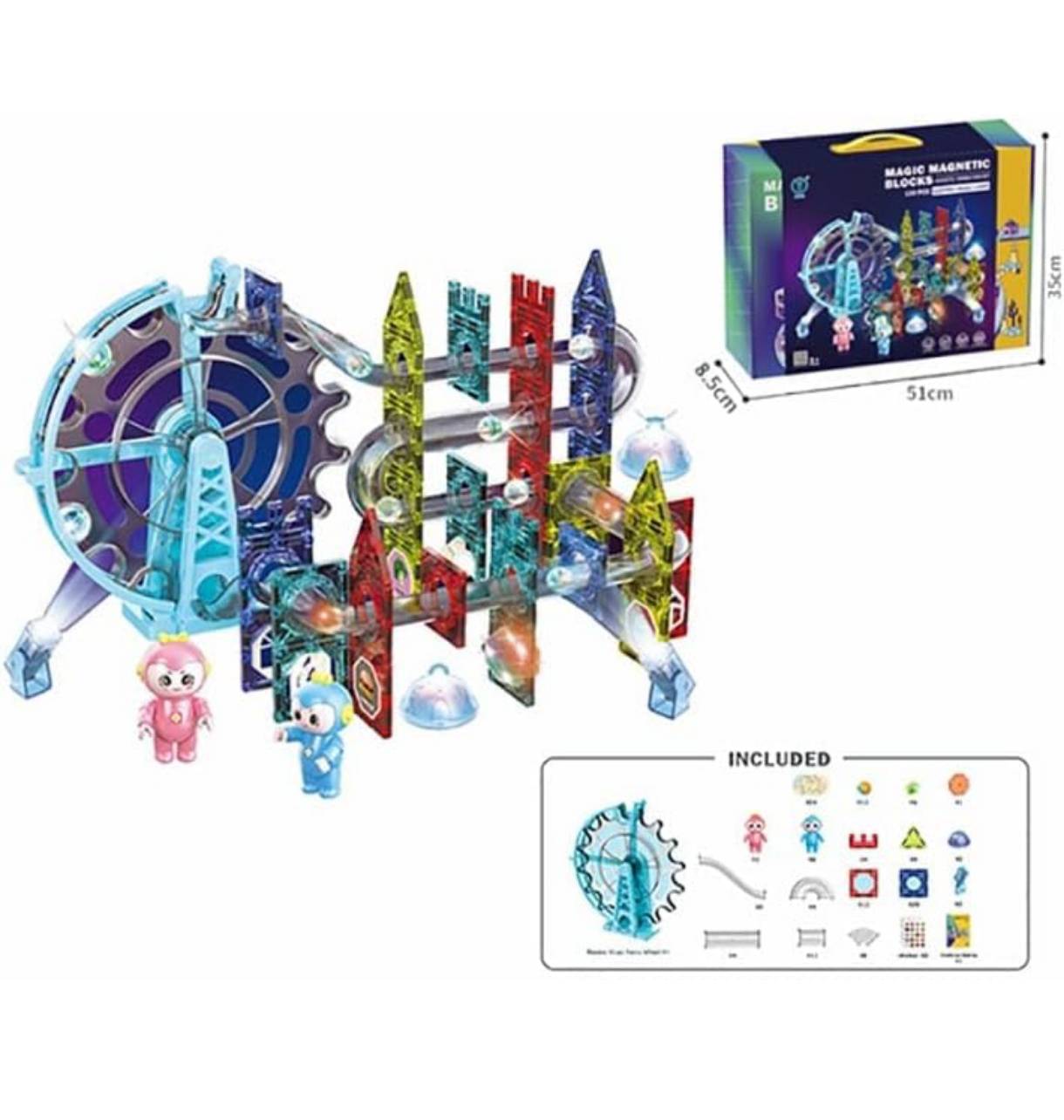 - بلوکهای مغناطیسی رنگی: به راحتی به هم متصل میشوند و امکان ساخت مسیرهای متنوع را فراهم میکنند.🌈
