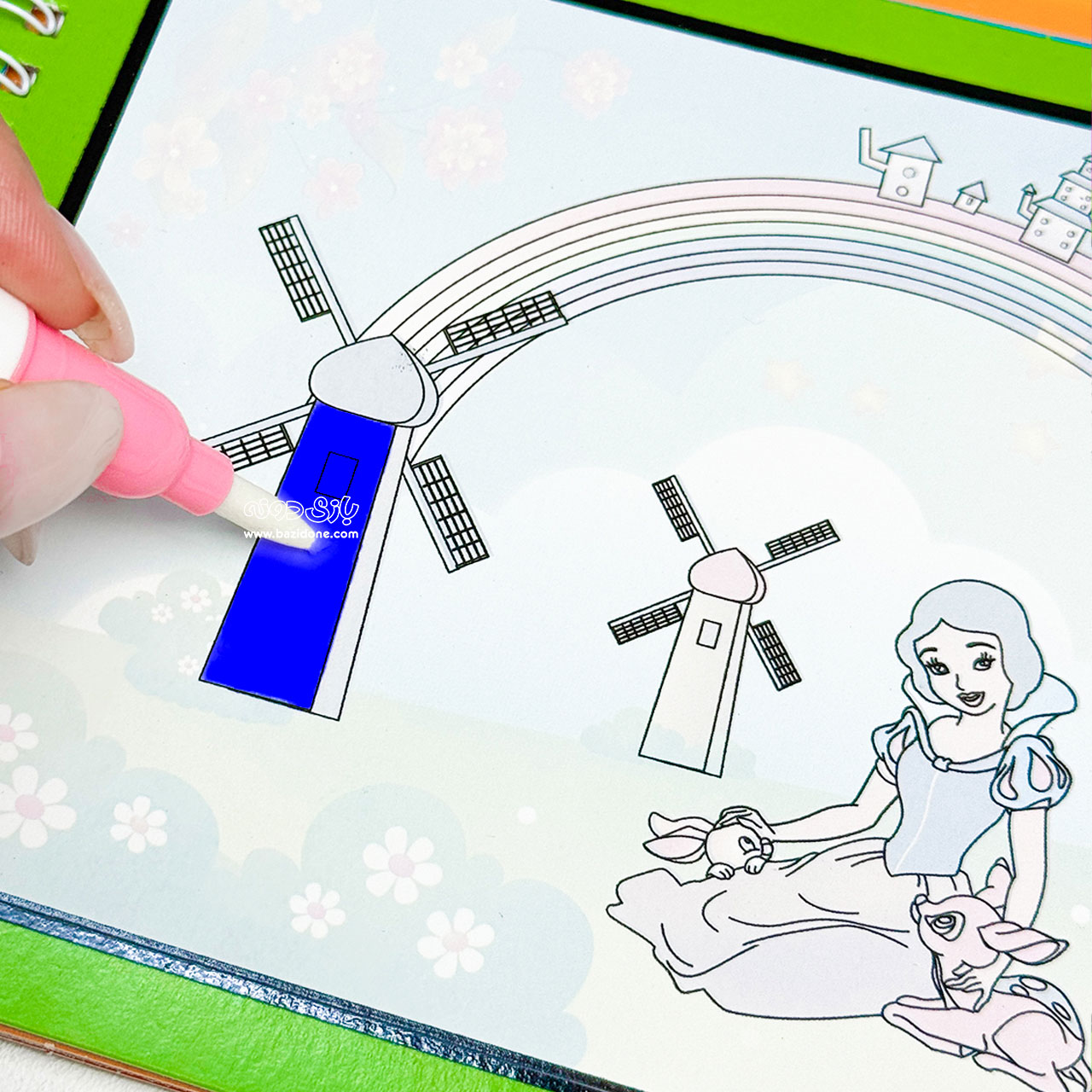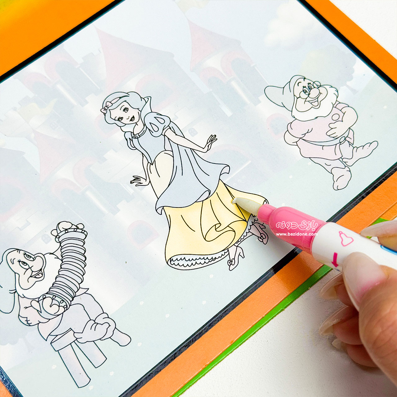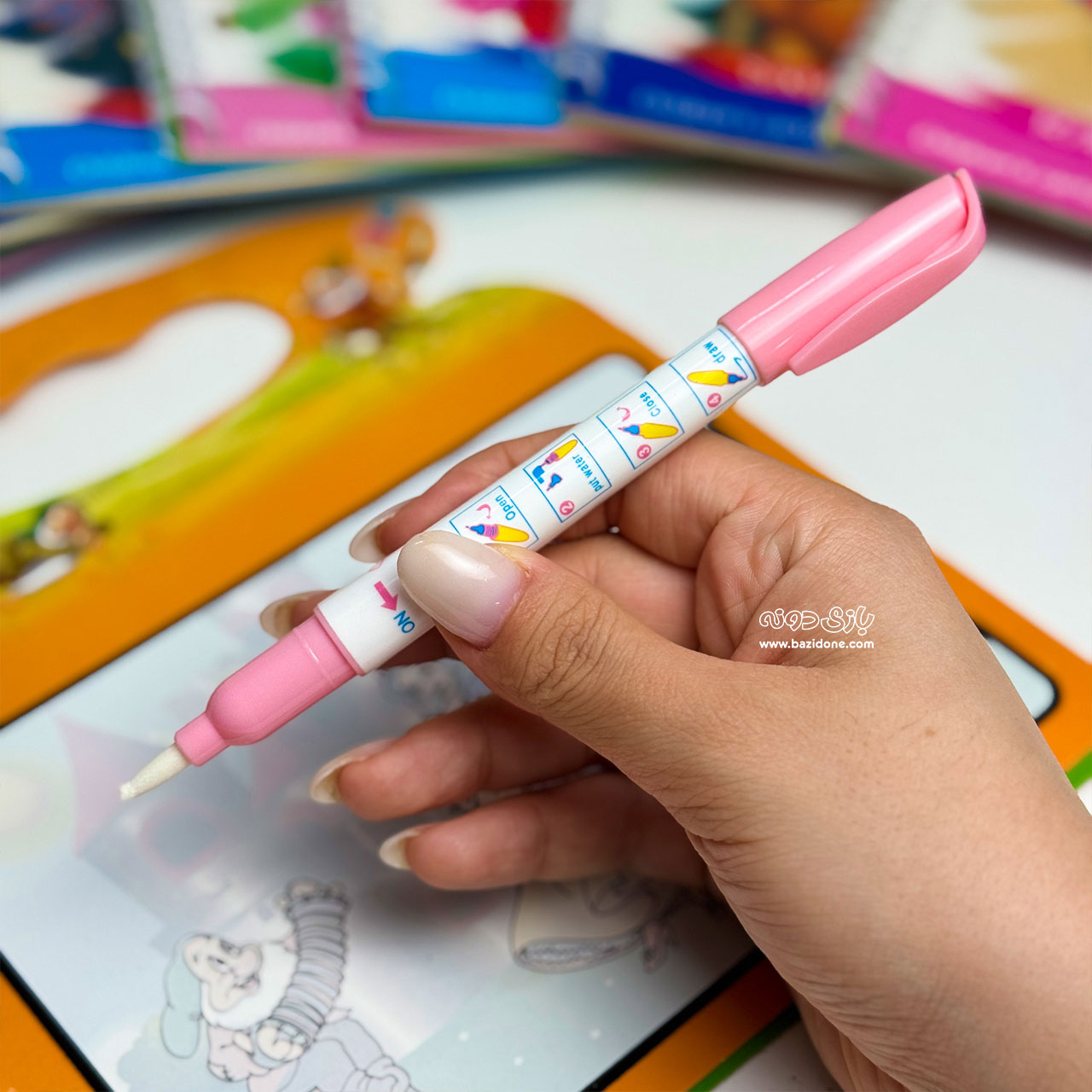 کودک با کشیدن ماژیک بی رنگ بر روی کتاب باعث می شود نقش های روی کتاب به صورت رنگی پدیدار شوند.هر کتاب شامل 4 برگ همراه 4 طرح شاد و کودکانه یمختلف است که کودک شما فقط با کشیدن ماژیک مخصوصبرروی آن یک نقاشی زیبا خلق می کند.اگر کودک شما این ماژیک را برروی دیوار ، فرش ، مبل و … بکشدهیچ آسیبی به وسایل شما نخواهد رسید