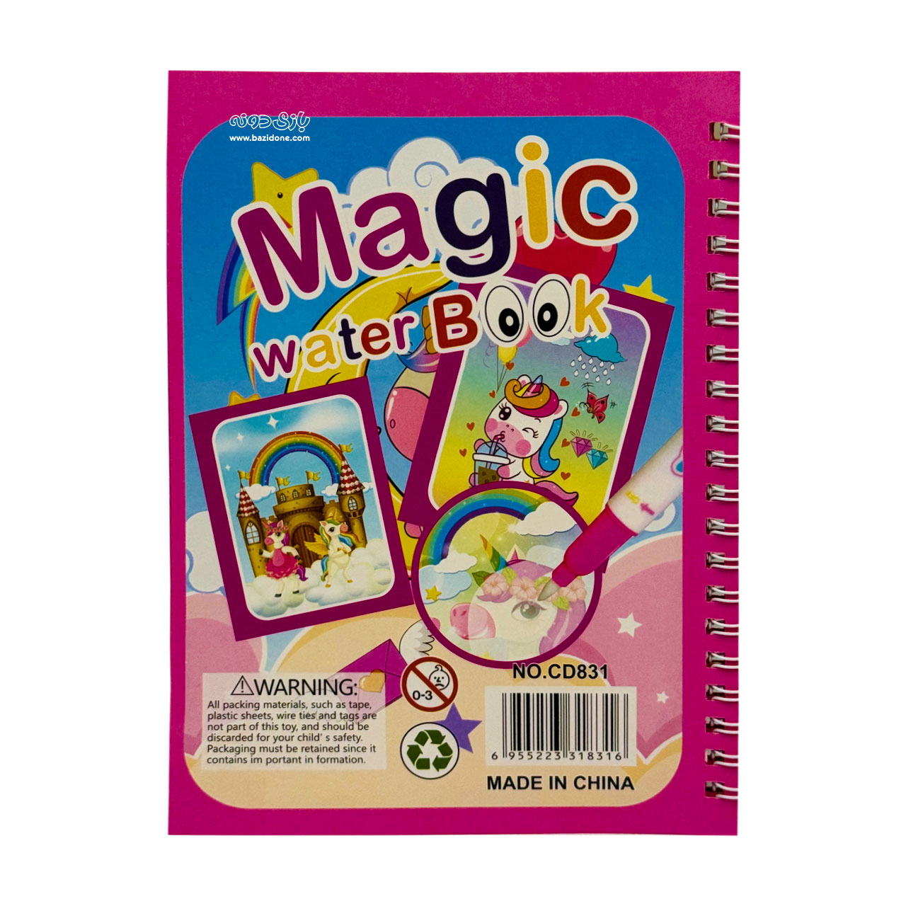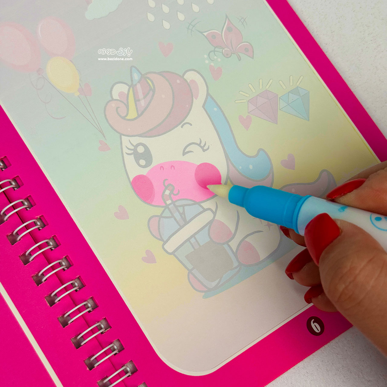 قلم جادویی و صفحات رنگینکمانی مجیک واتر هسته اصلی این کتاب جادویی رنگآمیزی با آب، در قلم و صفحات آن نهفته است. ماژیک موجود در بسته، تنها با آب پر میشود. این ماژیک بیرنگ است و تضمین میکند که هیچ لکهای بر روی مبلمان، فرش یا لباس کودک باقی نماند. کتاب شامل 4 صفحه با طرحهای شاد و کودکانه از دنیای اسبهای تک شاخ است. به محض اینکه کودک قلم خیس را روی صفحه میکشد، تصاویر به شکلی جادویی با رنگهای زنده و جذاب پدیدار میشوند. این لحظه کشف و دیدن رنگهای مخفی، برای کودک بسیار هیجانانگیز و لذتبخش است.