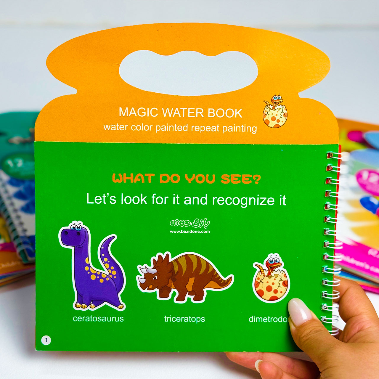 کافیه ماژیک جادویی رو پر از آب کنید 💧 و روی صفحات کتاب بکشید! 😊 نقاشیهای رنگی به صورت جادویی ظاهر میشن ✨ و بعد از چند دقیقه پاک میشن. حالا کوچولوی شما میتونه دوباره و دوباره نقاشی بکشه! 😊