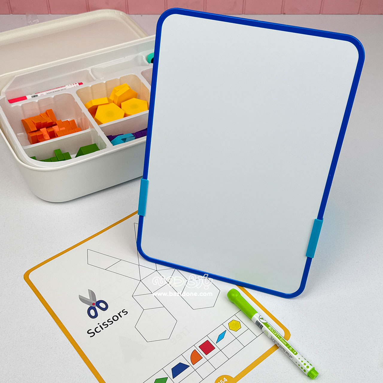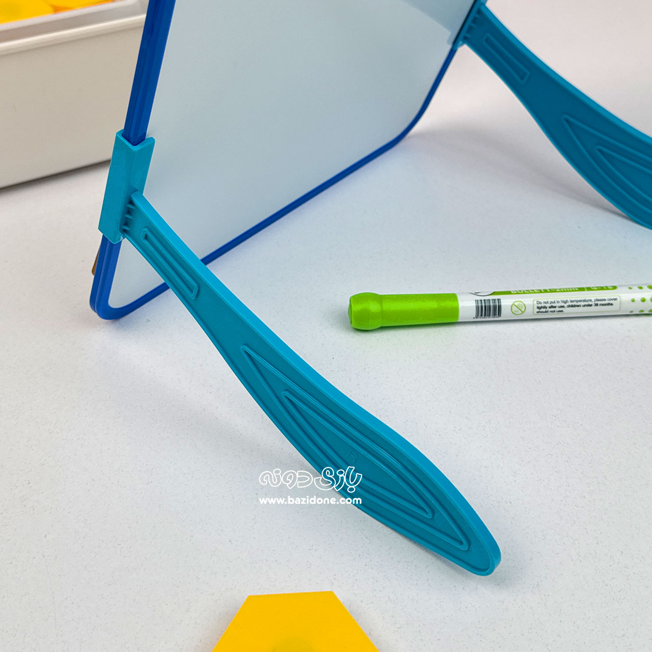 - بخش وایتبرد برای نقاشی و نوشتن: با استفاده از 3 عدد ماژیک و تخته پاک کن همراه، کودک میتواند اشکال هندسی را بکشد، الگوهای جدید خلق کند یا صحنههایی را که با قطعات ساخته، نقاشی نماید. این ترکیب خلاقیت تصویری را در کنار خلاقیت فضایی تقویت میکند.