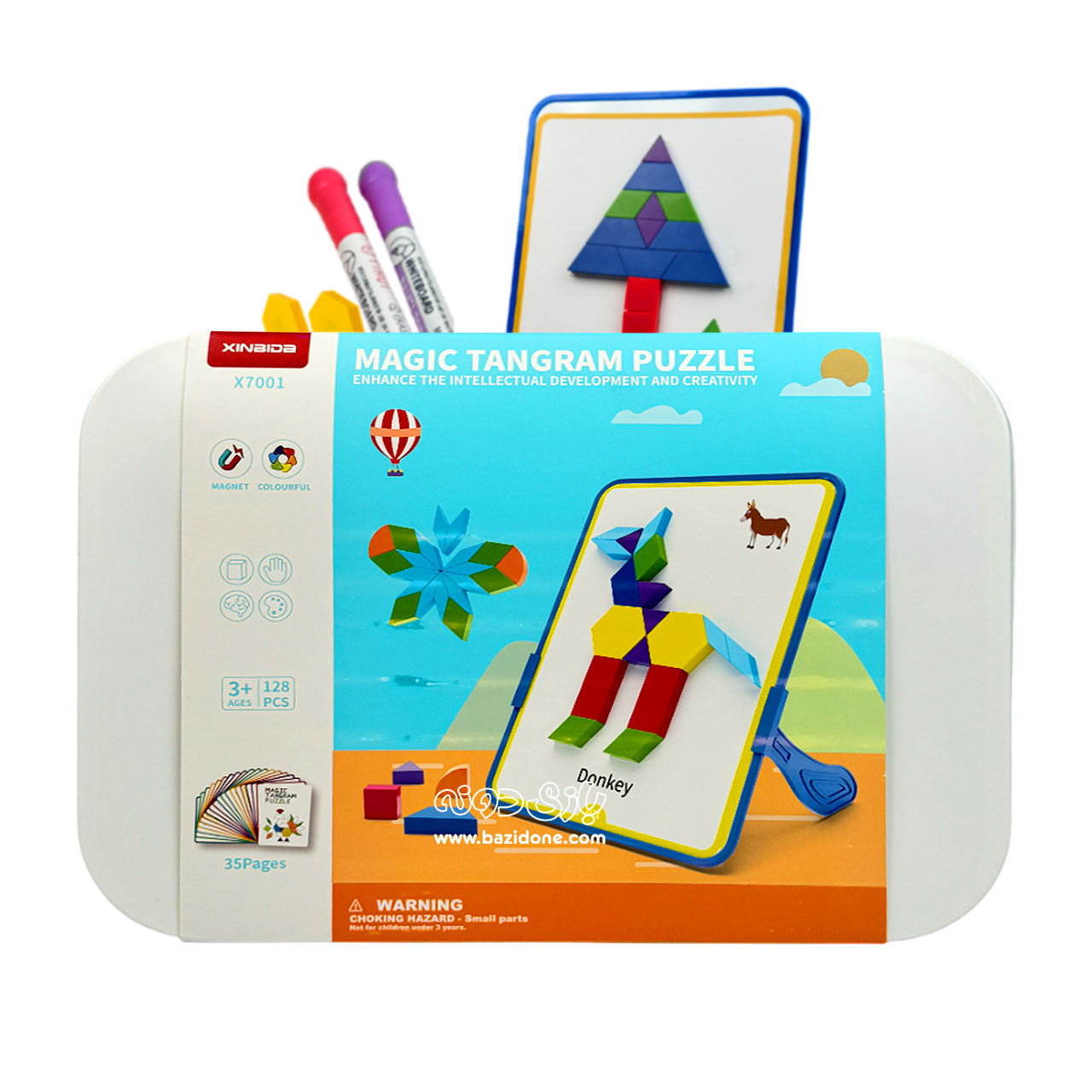 128 قطعه و ابزارهای کامل: محتویات بسته باکس پازل تنگرام جادویی