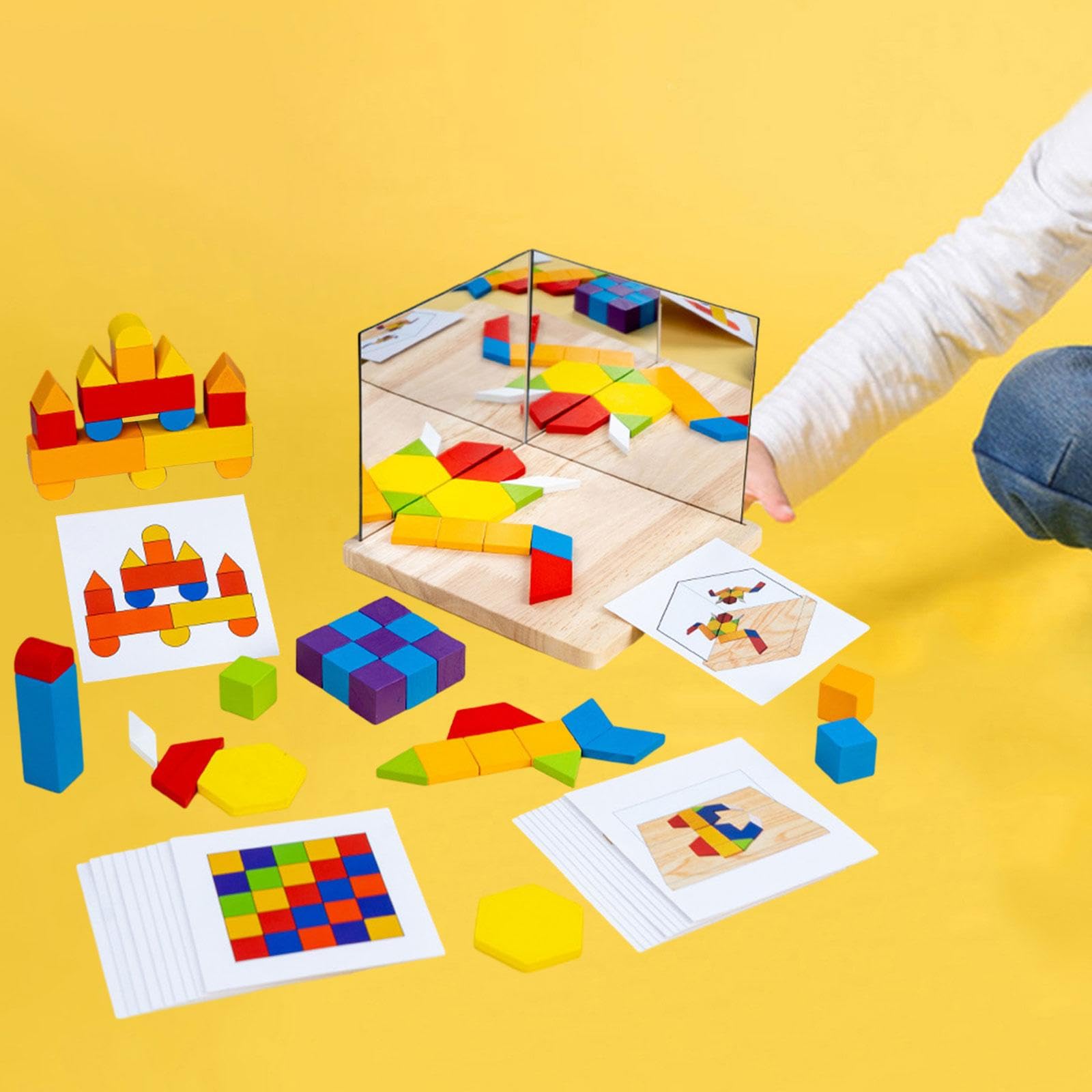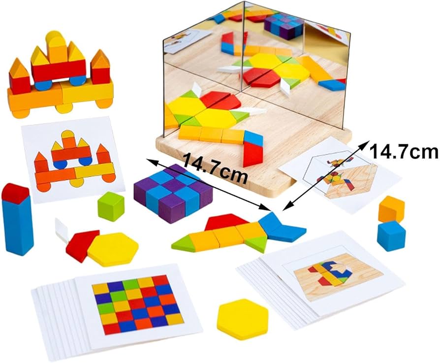 - شامل: تعدادی بلوک چوبی با اشکال هندسی گوناگون و یک آینه و کارت های راهنما 🧩