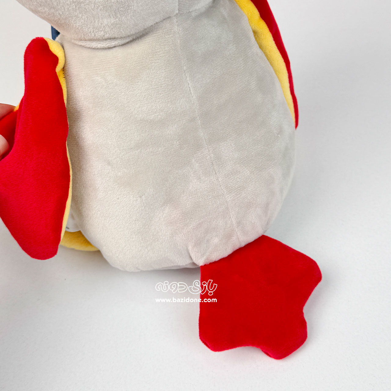 - بافتهای حسی و صدادار در بال و دم: دم و دستهای پولیشی و نرم عروسک به صورت حسی طراحی شدهاند و هنگام لمس صدا میدهند. این صداها و بافتهای متنوع، حس لامسه و شنوایی کودک را تقویت کرده و او را به کاوش بیشتر تشویق میکند.