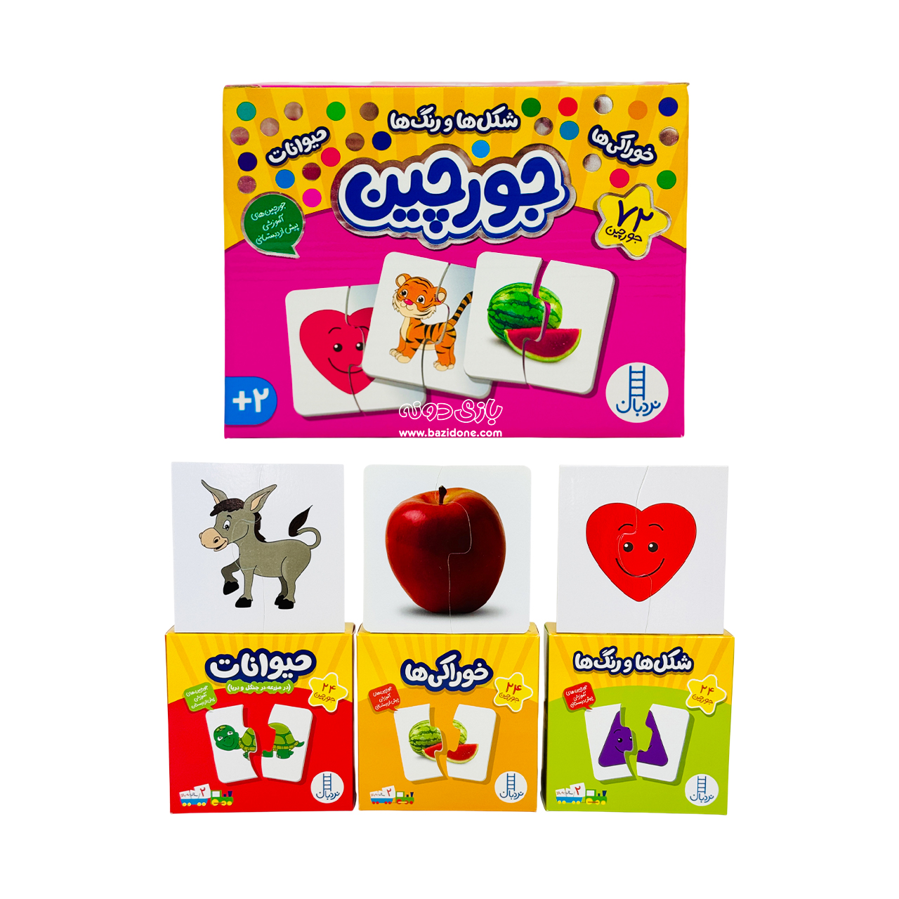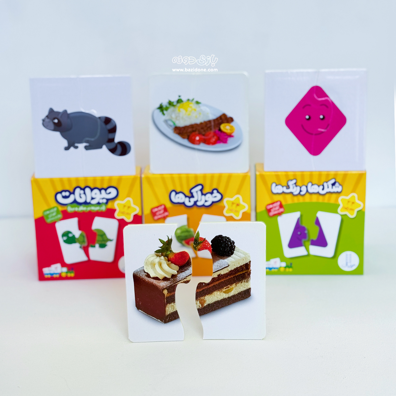- 🧩 ۳۶ کارت دوتکه: این جورچین شامل ۳۶ کارت جذاب با تصاویری از حیوانات، شکلها، رنگها و خوراکیهاست.