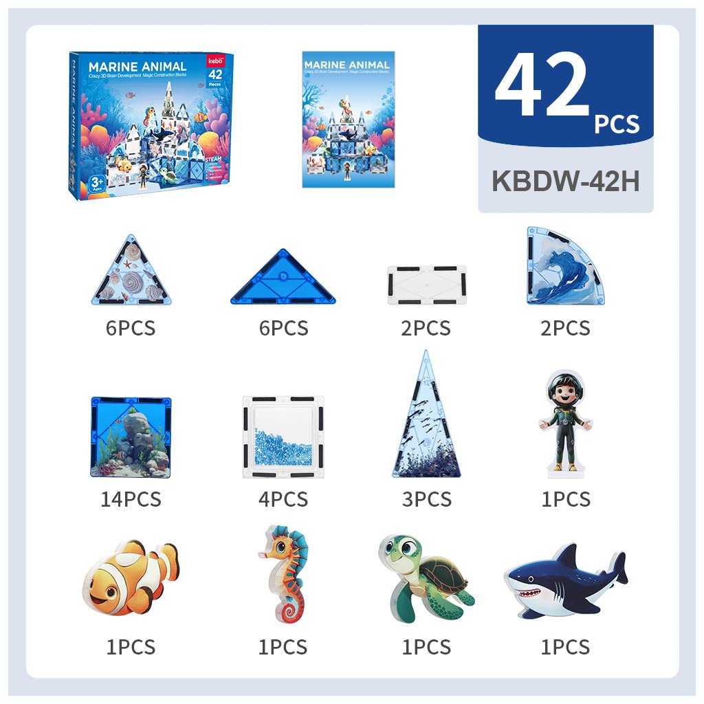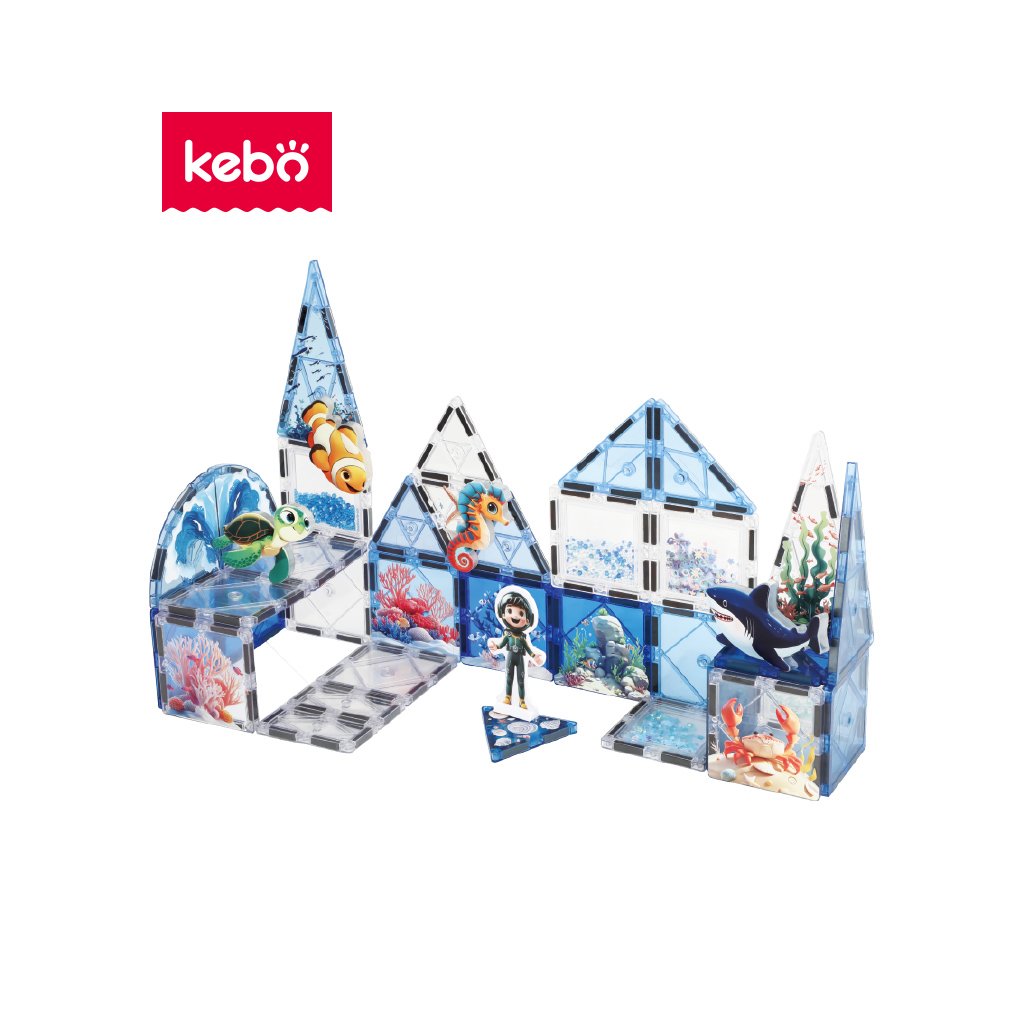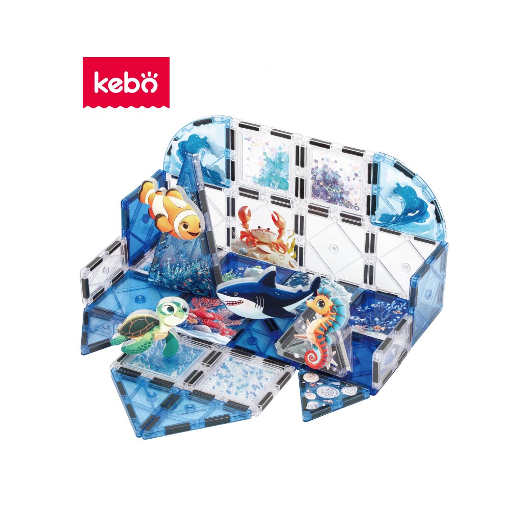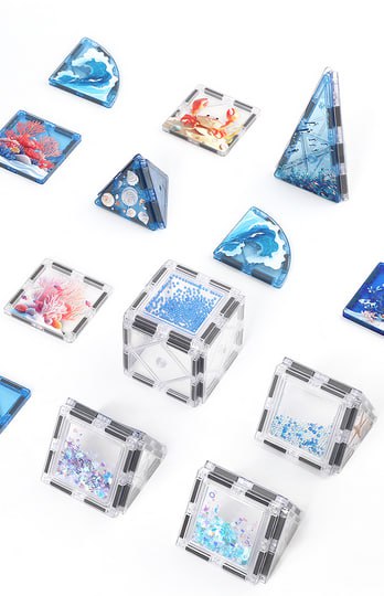 - تایلهای مغناطیسی: 42 قطعه تایل مغناطیسی در شکلها و اندازههای مختلف (مربع، مثلث و…) که طرح حیوانات دریایی روی اونها چاپ شده. این تایلها با لبههای صاف و صیقلی، برای دستهای کوچک کودکان ایمن و مناسب هستن.