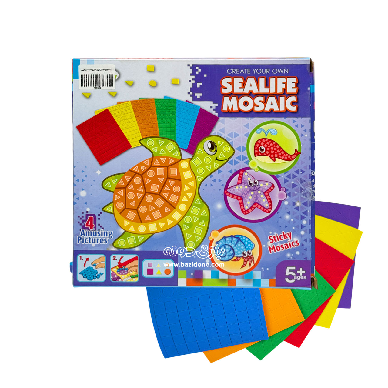 خیلی آسونه! 😊 کافیه کاشیهای رنگی رو بردارید و با توجه به راهنمای روی طرح، اونها رو روی جای مناسبشون بچسبونید. 😉 کمکم میبینید که یه تصویر زیبا از موجودات دریایی، زیر دستهاتون جون میگیره! 🤩