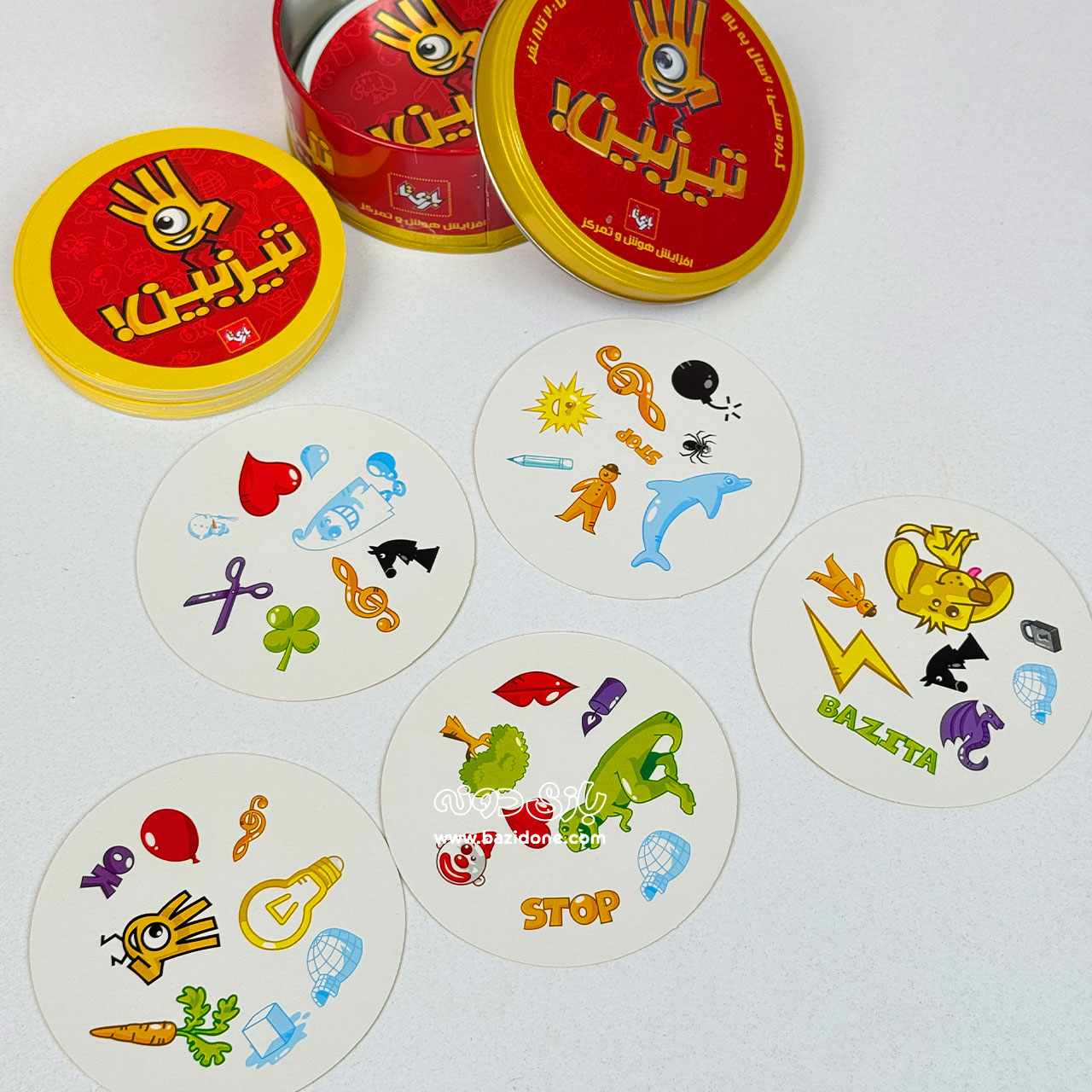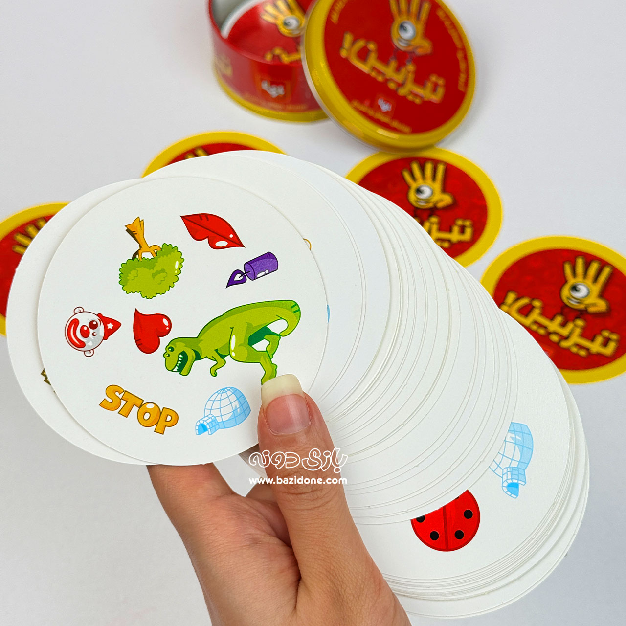 - 55 کارت بازی دایرهای شکل: هر کارت با 8 تصویر رنگارنگ و جذاب طراحی شده است. این کارتها قلب تپنده بازی و کلید ورود شما به دنیای سرعت و دقت هستند.