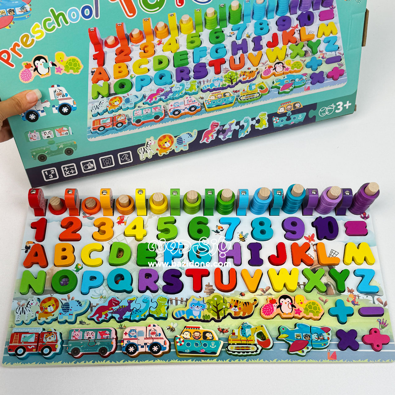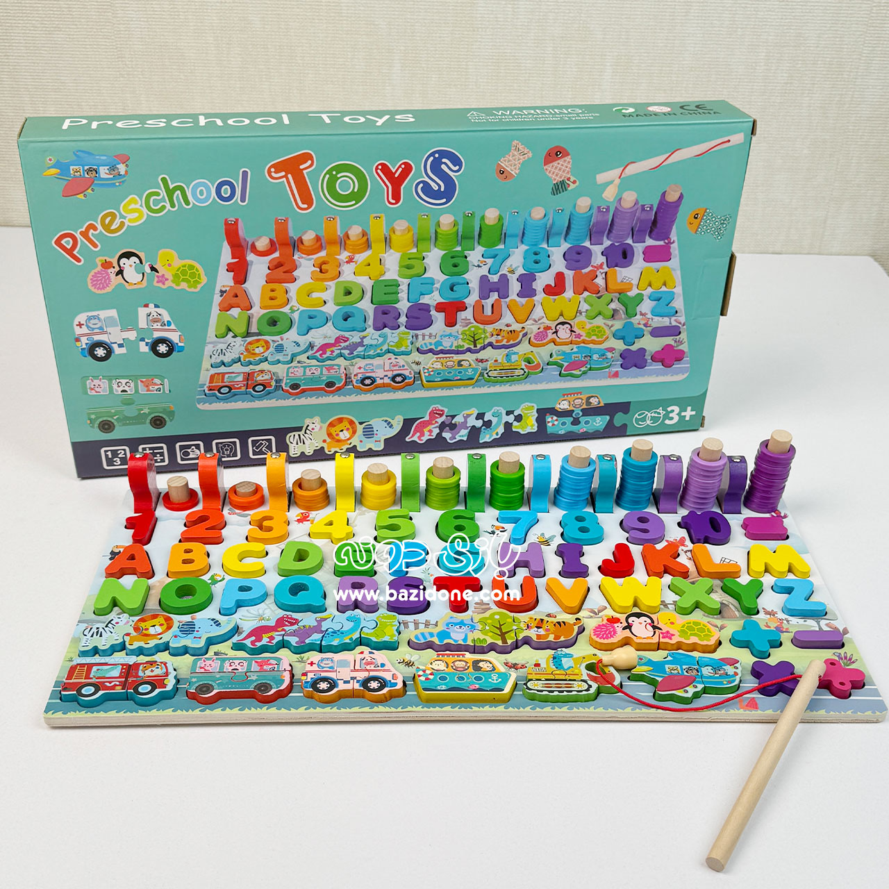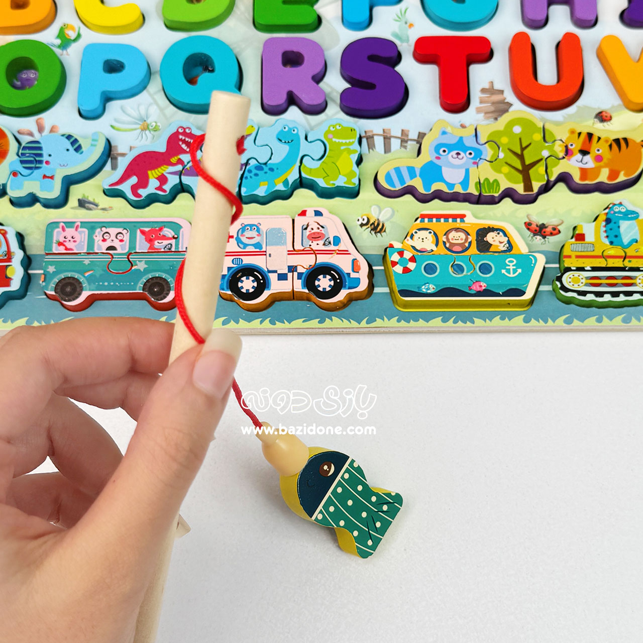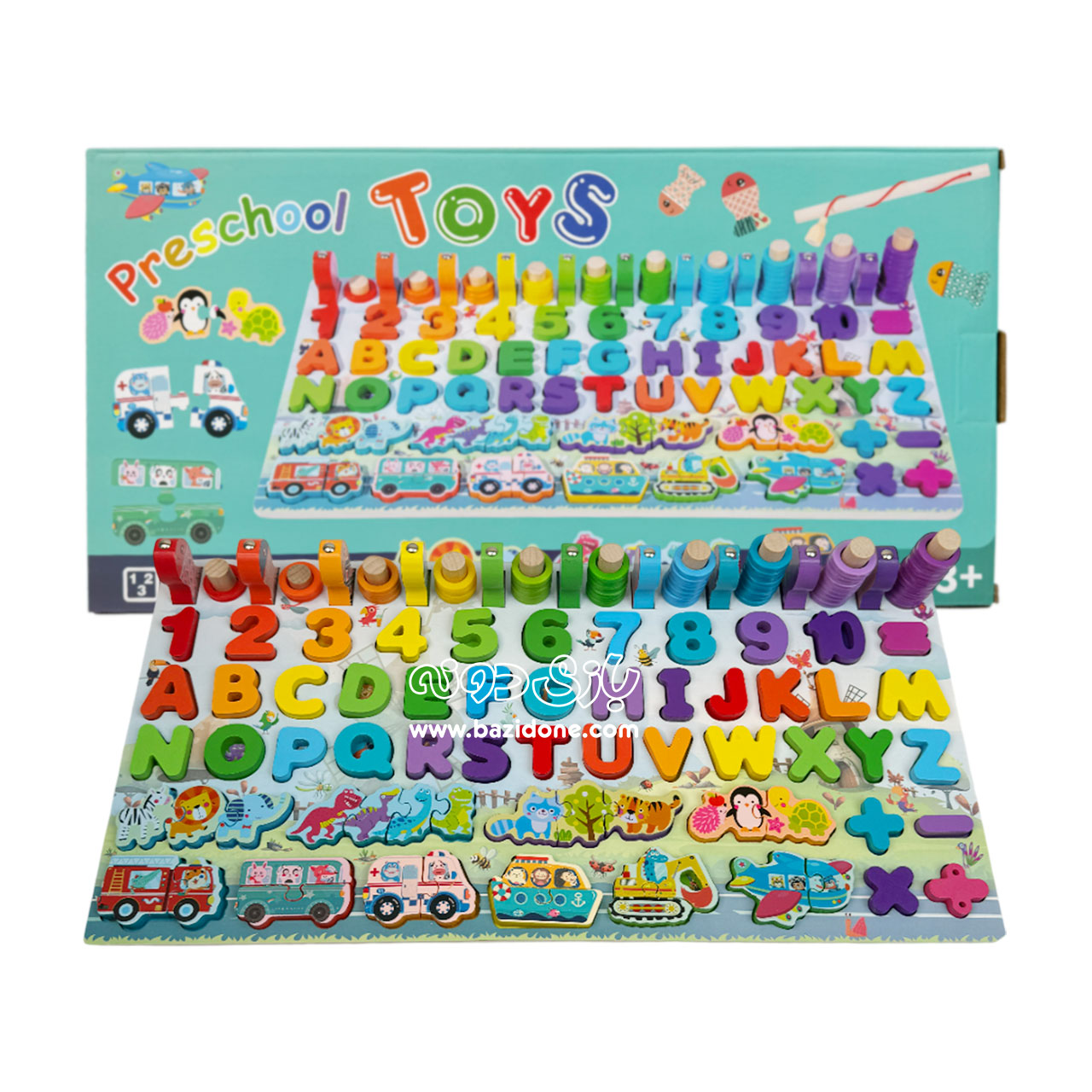 بر روی این تخته آموزشی چند کاره،حروف انگلیسی، اعداد انگلیسی یک تا ده ،علامت های جمع و تفریق ریاضی،میله و حلقه های مخصوص شمارش ، و ده عدد ماهی چوبی مگنتی همراه با یک عدد قلاب چوبی،پازل نقلیه،مشاغل وحیوانات را شامل می شود تا کودکان بتوانند مهارت دست ورزی و دقت و توجه خود را به چالش بکشند.
