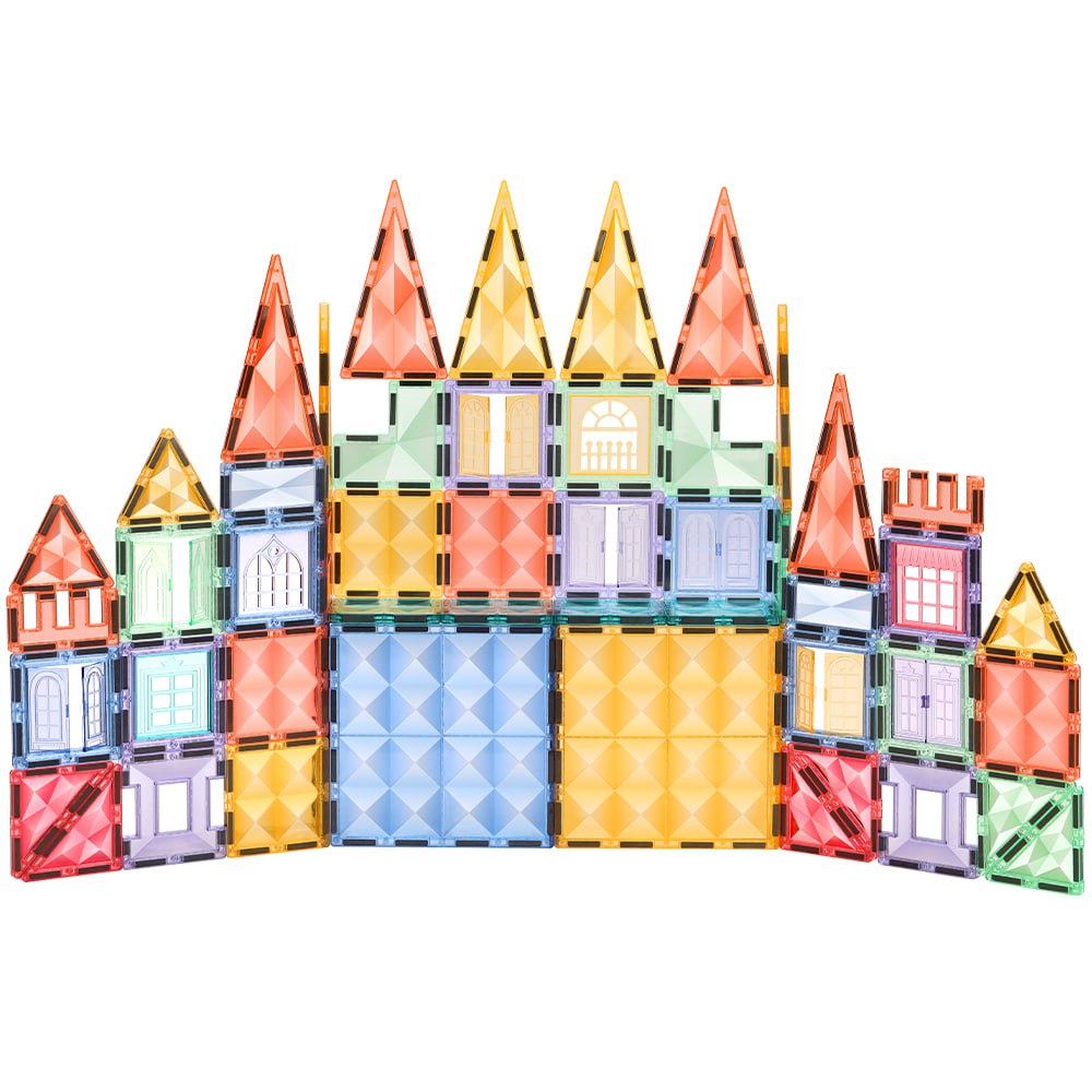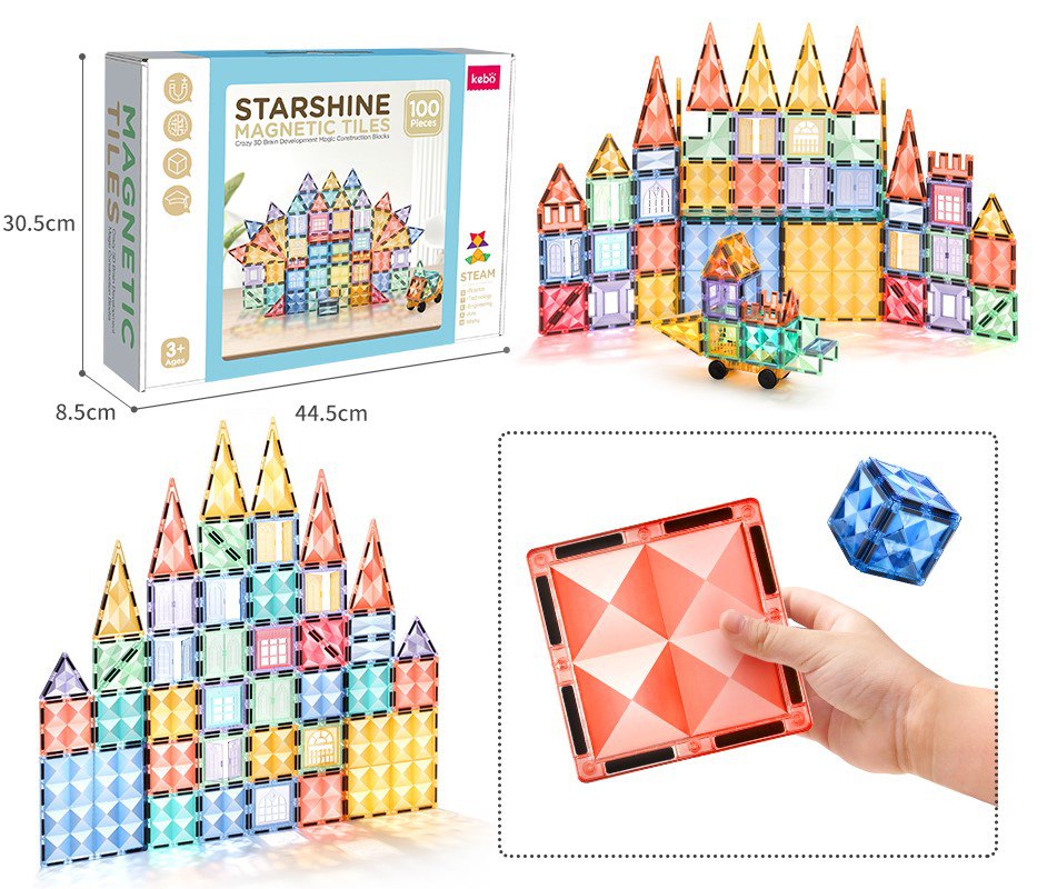 - تایلهای مغناطیسی: 100 قطعه تایل مغناطیسی در شکلها و اندازههای مختلف (مربع، مثلث، لوزی و…) که برای ساختن سازههای مختلف مناسب هستند. این تایلها با لبههای صاف و صیقلی، برای دستهای کوچک کودکان کاملاً ایمن و مناسب هستند.