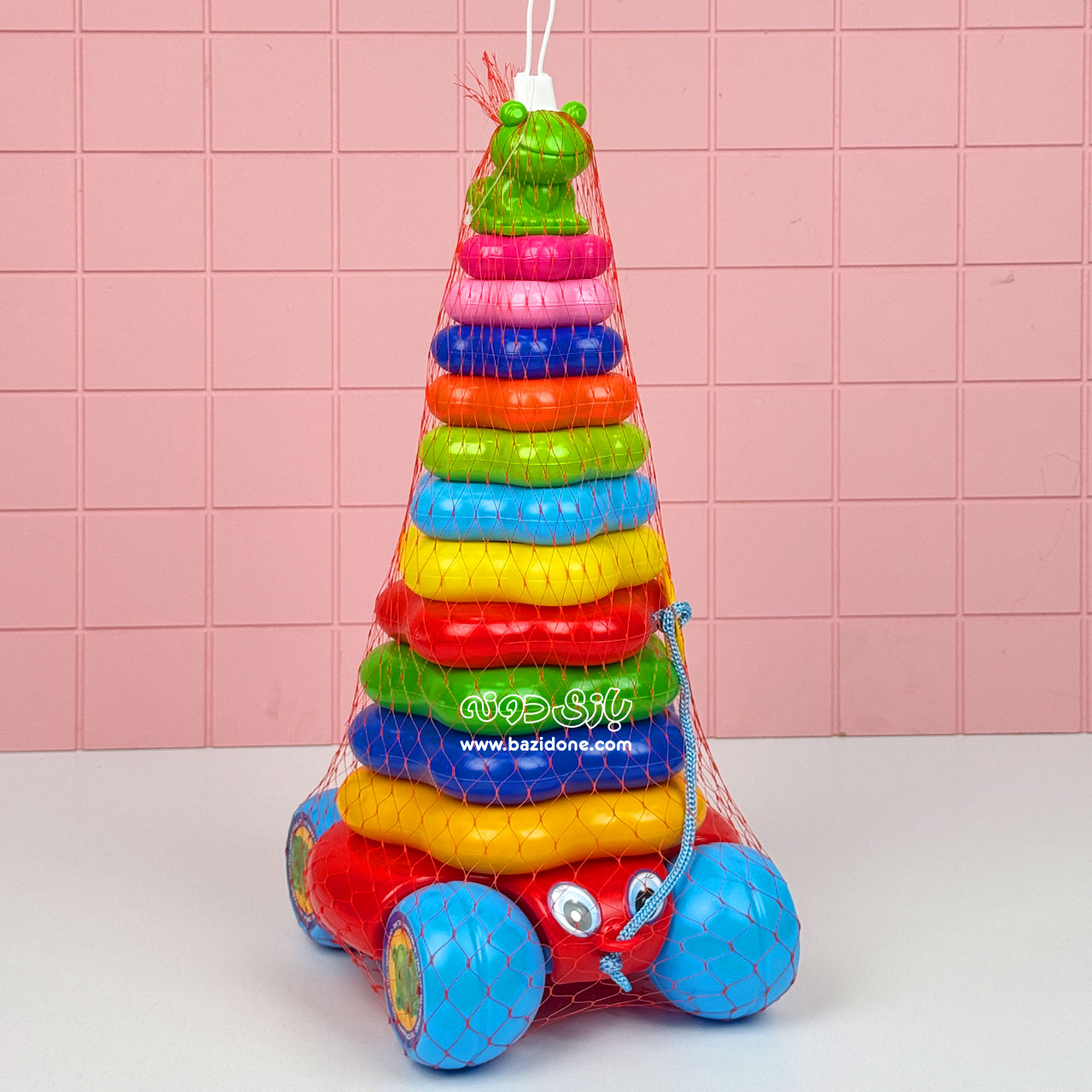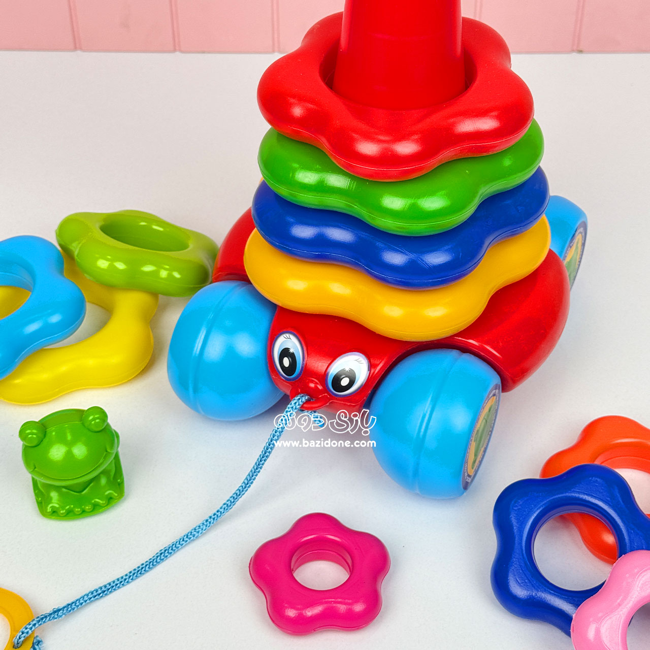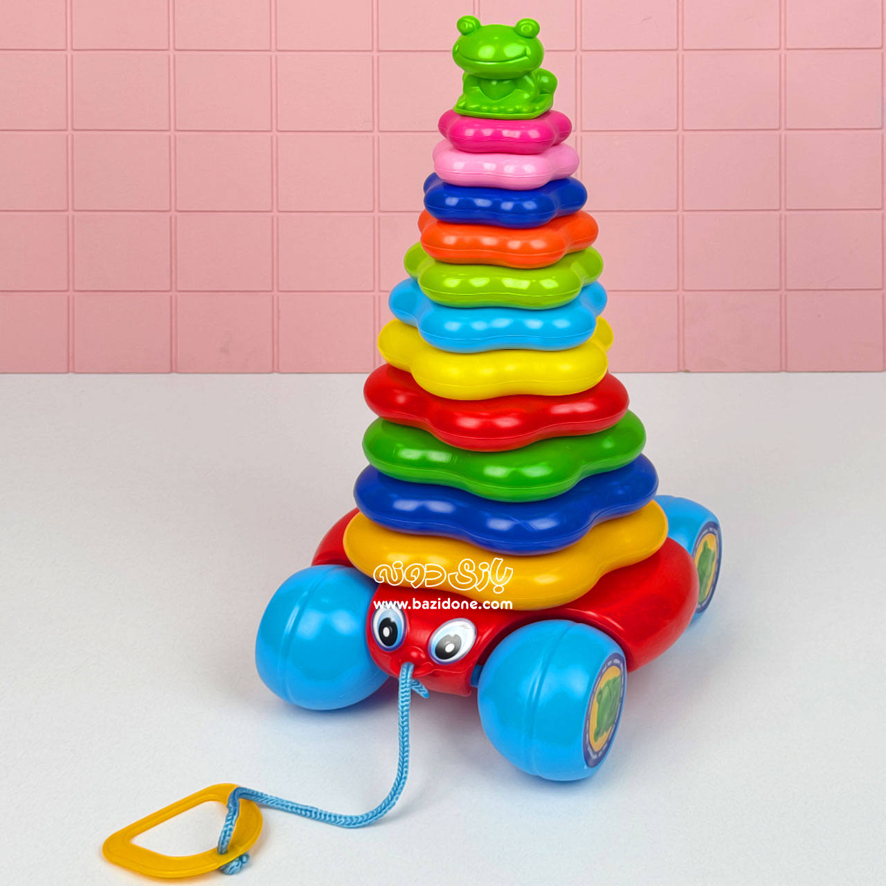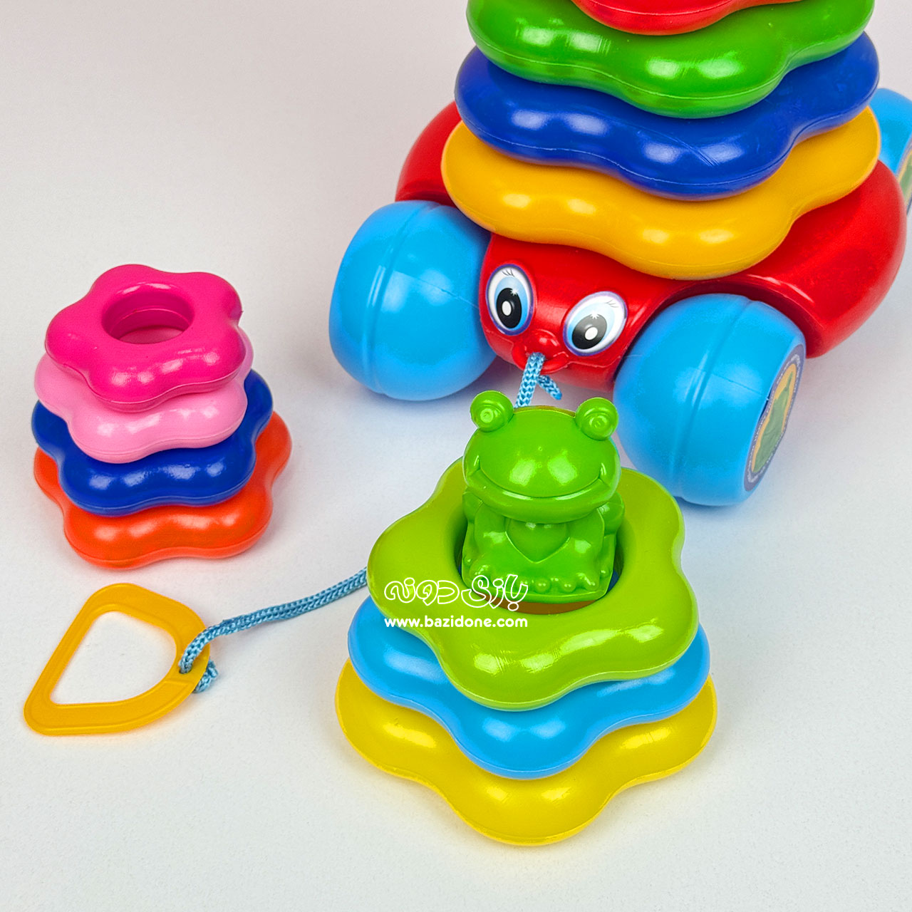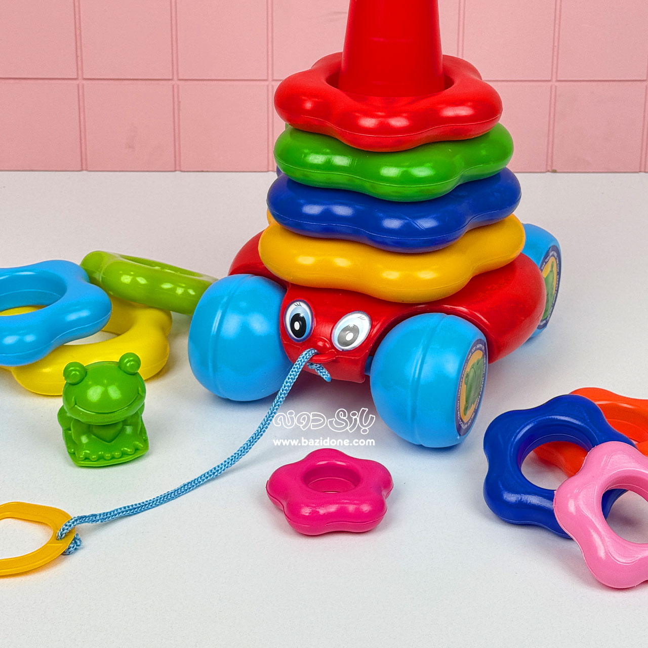 - تقویت مهارتهای حرکتی ظریف و درشت: کودک با در دست گرفتن، چیدن و پرتاب حلقهها، هماهنگی عصب و عضله خود را تقویت میکند. وجود چرخ و نخ در این اسباببازی، او را تشویق میکند تا آن را به دنبال خود بکشد، که به تقویت مهارتهای حرکتی درشت و تعادل او کمک شایانی میکند. 💪