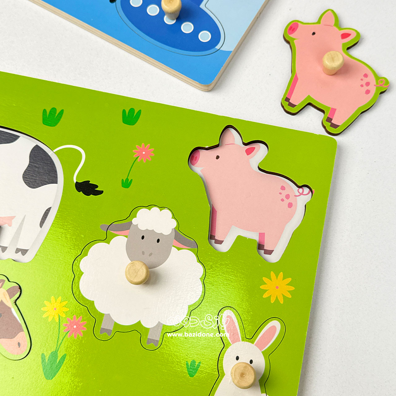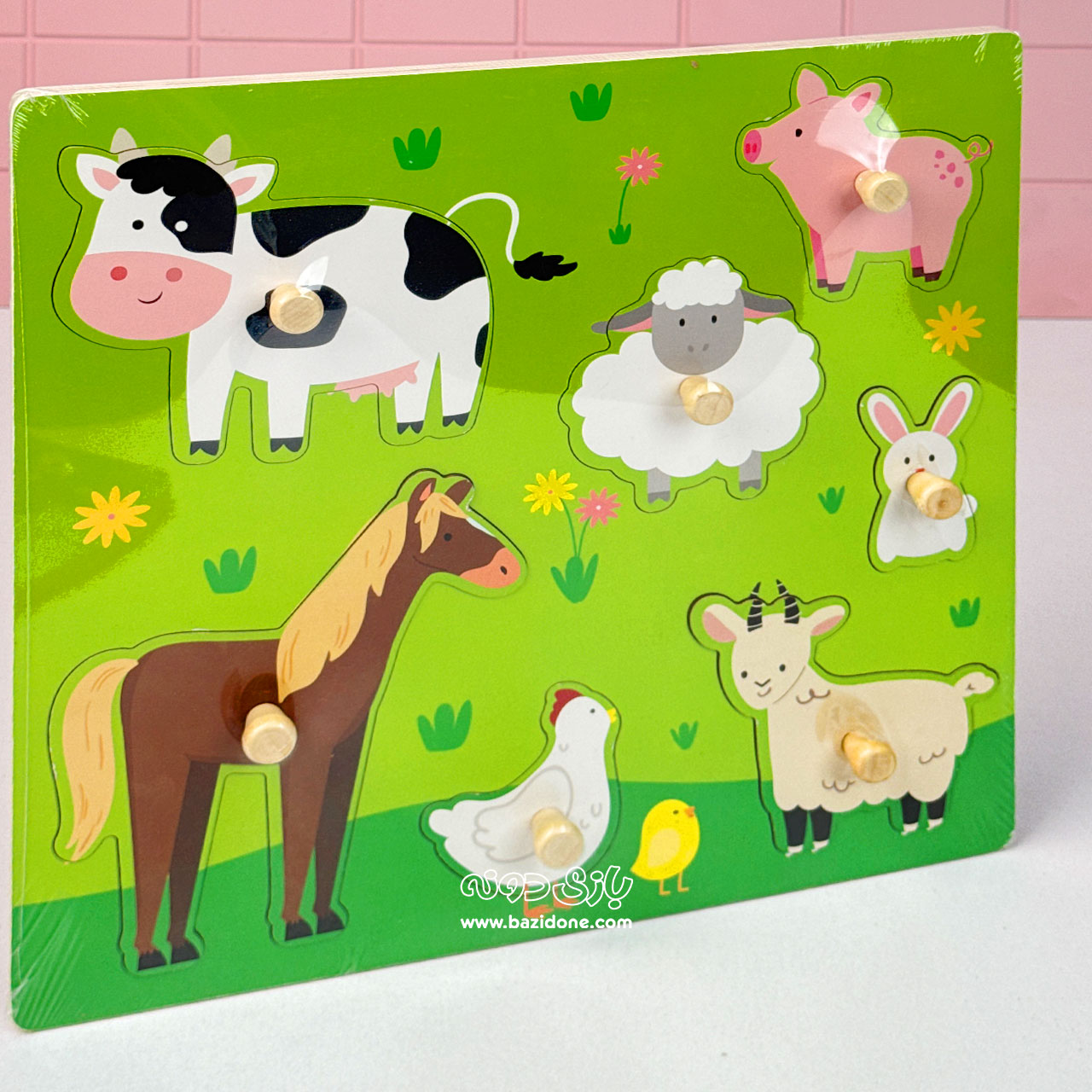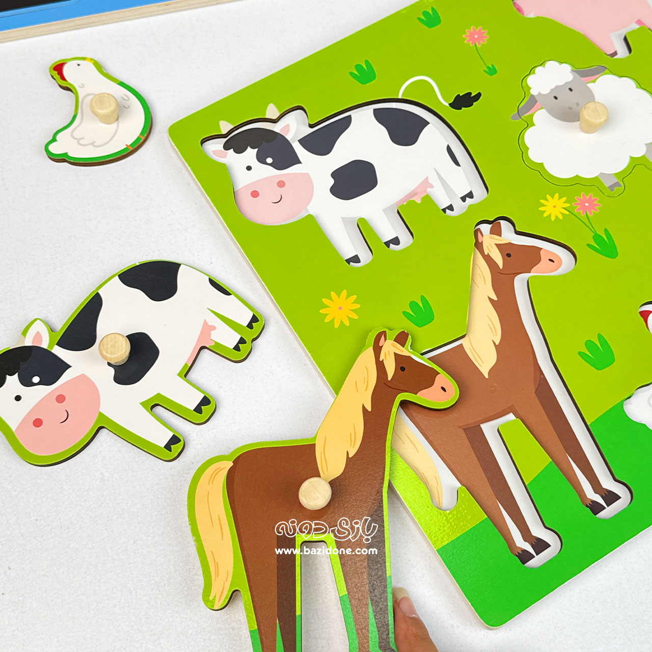 - 1 عدد پازل چوبی پیندار با تم حیوانات: شامل یک تخته چوبی بزرگ با رنگهای شاد (معمولاً سبز) و چندین قطعه حیوانات مزرعه (مانند گاو، اسب، خوک، اردک و گوسفند).