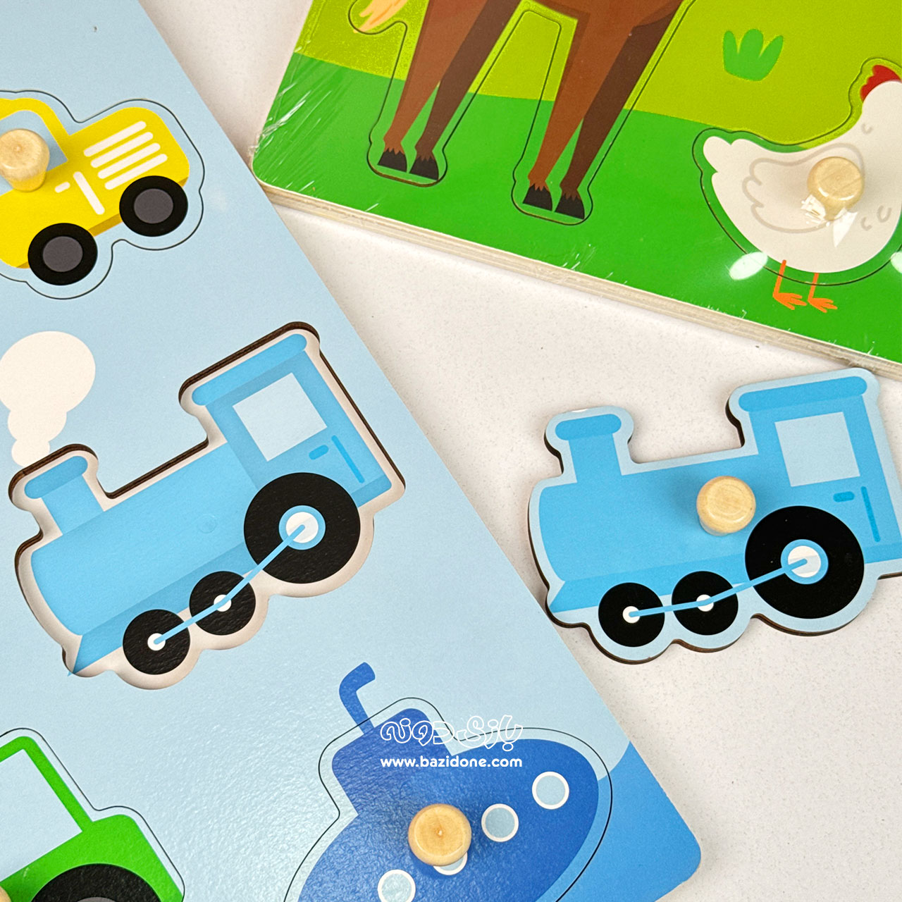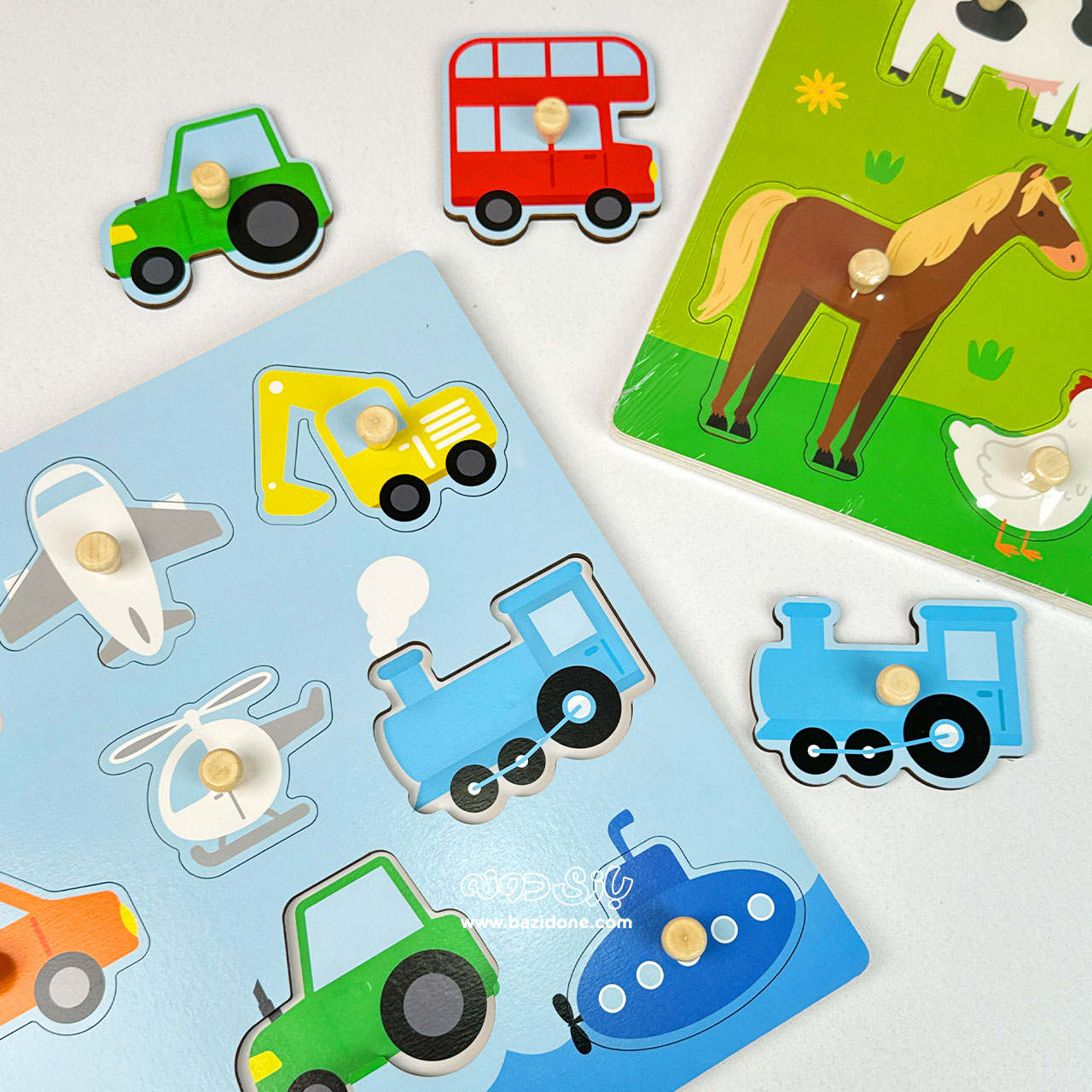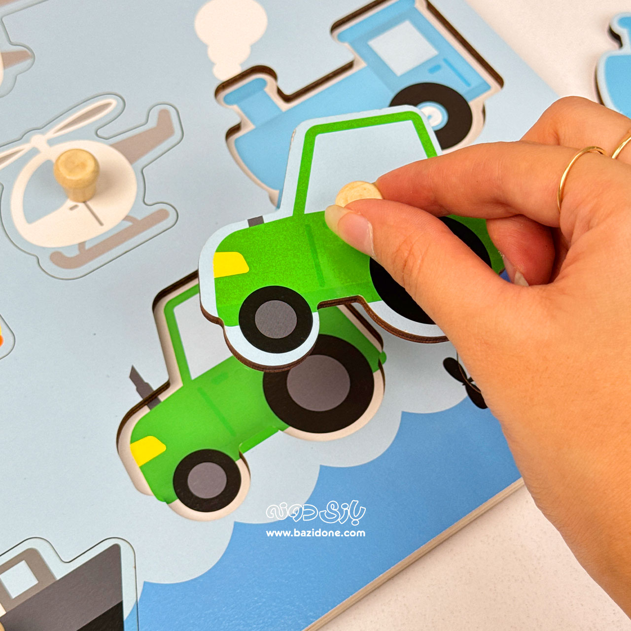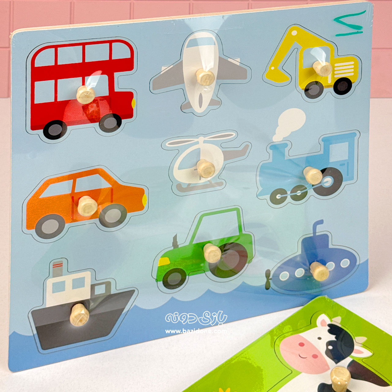 - 1 عدد پازل چوبی پیندار با تم وسایل نقلیه: شامل یک تخته چوبی بزرگ با رنگهای شاد (معمولاً آبی) و قطعات مربوط به انواع وسایل حمل و نقل (مانند ماشین، هواپیما، کشتی، هلیکوپتر و تراکتور).