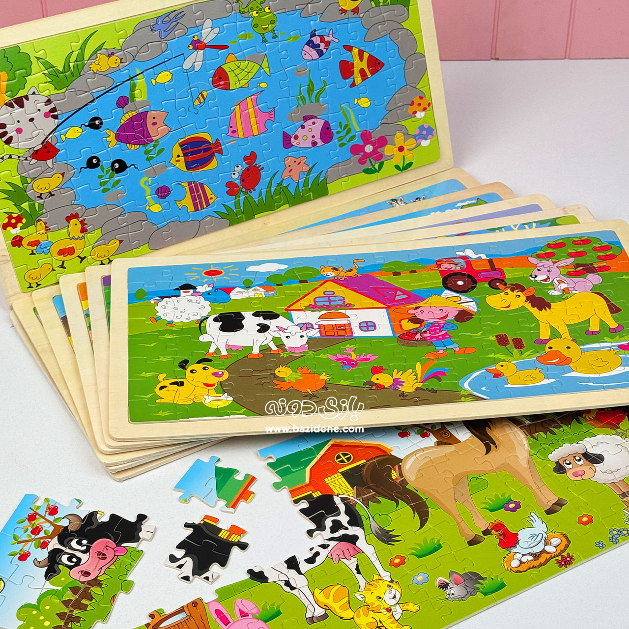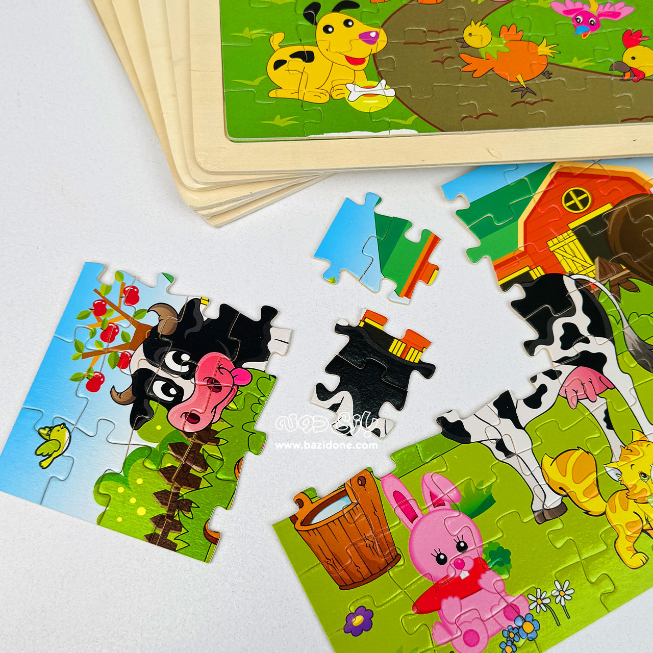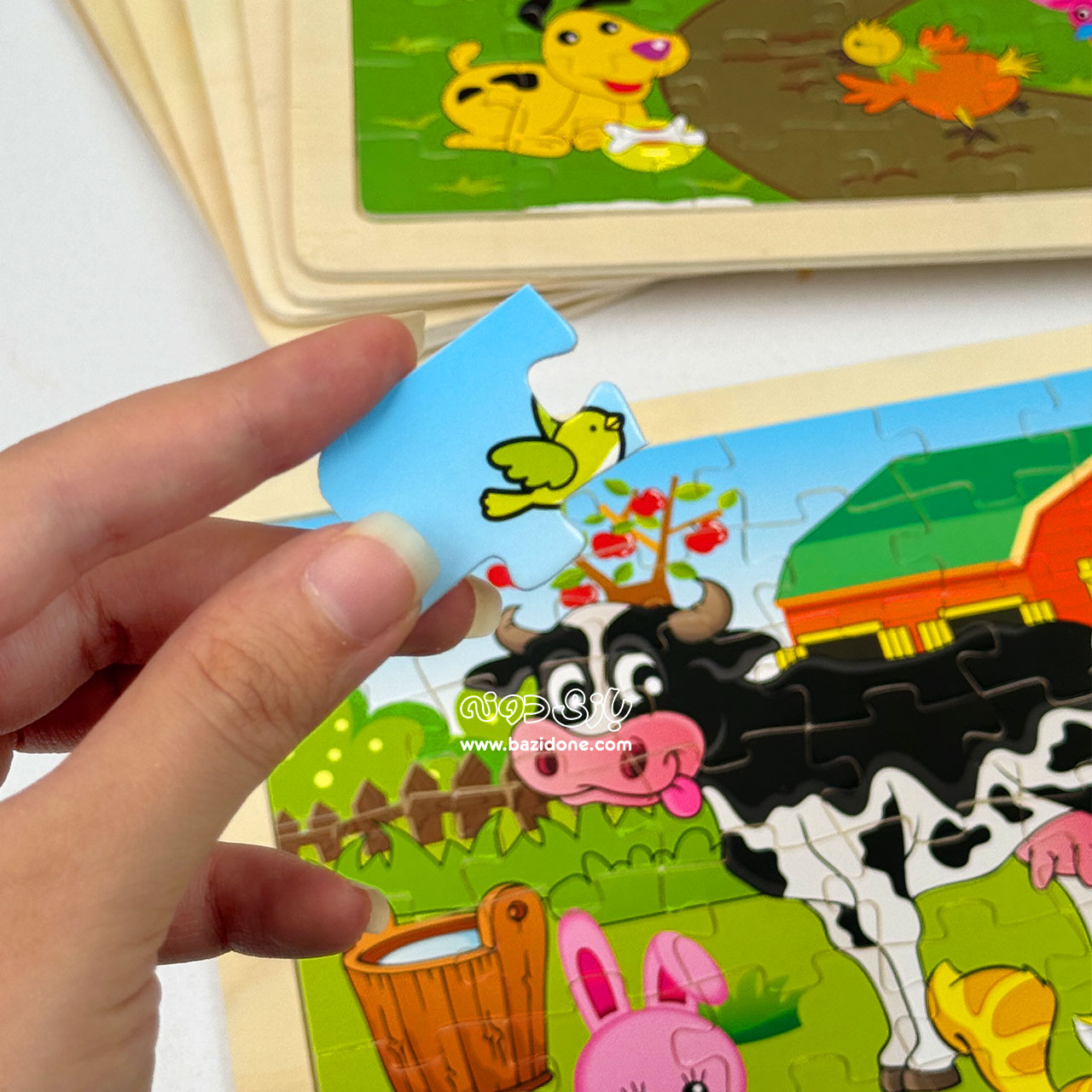 این پازل چوبی با 96 قطعه رنگی رنگی، یک دنیای جذاب از حیوانات و زندگی مزرعه رو پیش روی کوچولوی شما قرار میده. 🧩 هر قطعه از این پازل یک تکه از این داستان زیباست که باید کنار هم چیده بشه تا تصویر کامل بشه. 🖼️ با حل این پازل، کوچولوی شما میتونه با حیوانات مختلف مثل گاو 🐄، اسب 🐴، مرغ 🐔، اردک 🦆 و حتی سگ بامزه 🐶 آشنا بشه و اسمشون رو یاد بگیره.